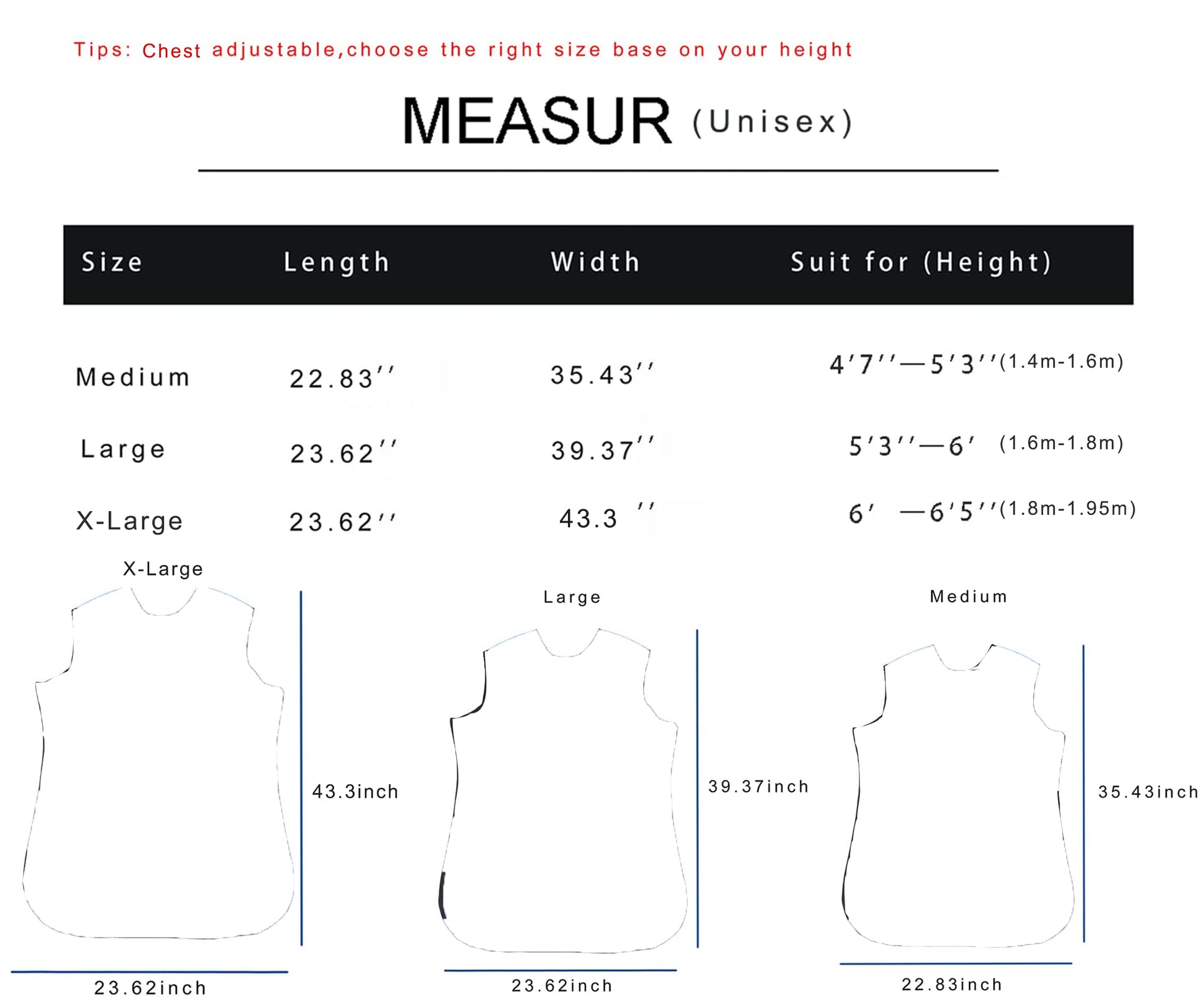 - MUTI-SIZE:Medium fit Height 4'7''— 5'3''(1.4m-1.6m),Large fit Height 5'3''— 6'(1.6m-1.78m). XL fit height 6'— 6'5"(1.78m-1.95m)Velcro design,adjustable width,special designed for North American people and European,it is ergonomic.When you wear it, you can stoop and walk without feeling heavy and constrained.