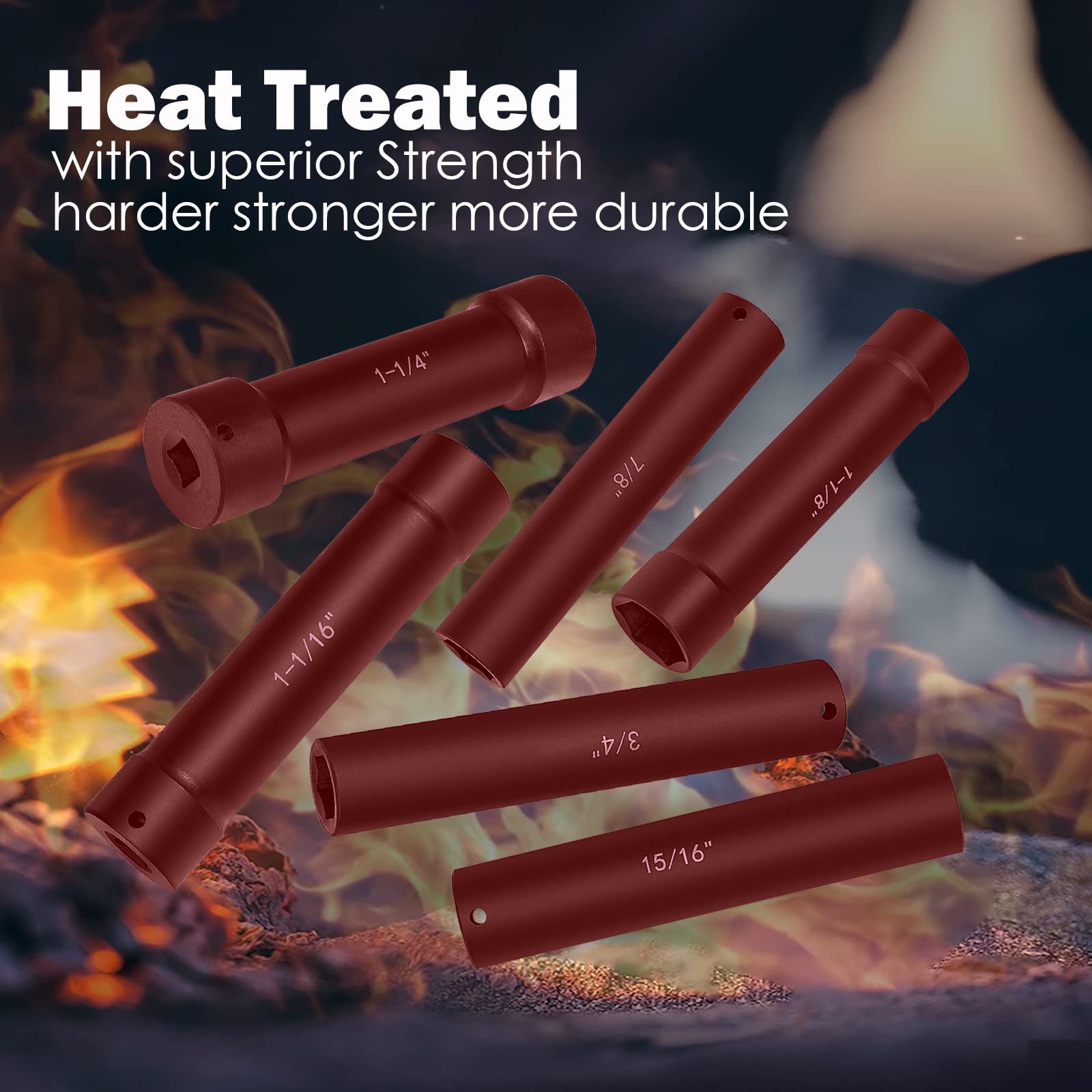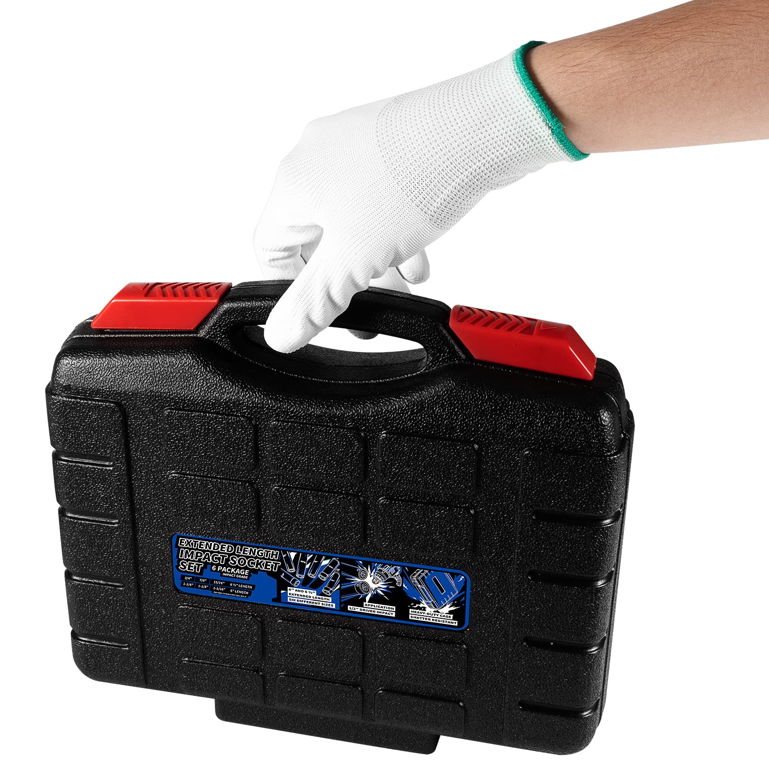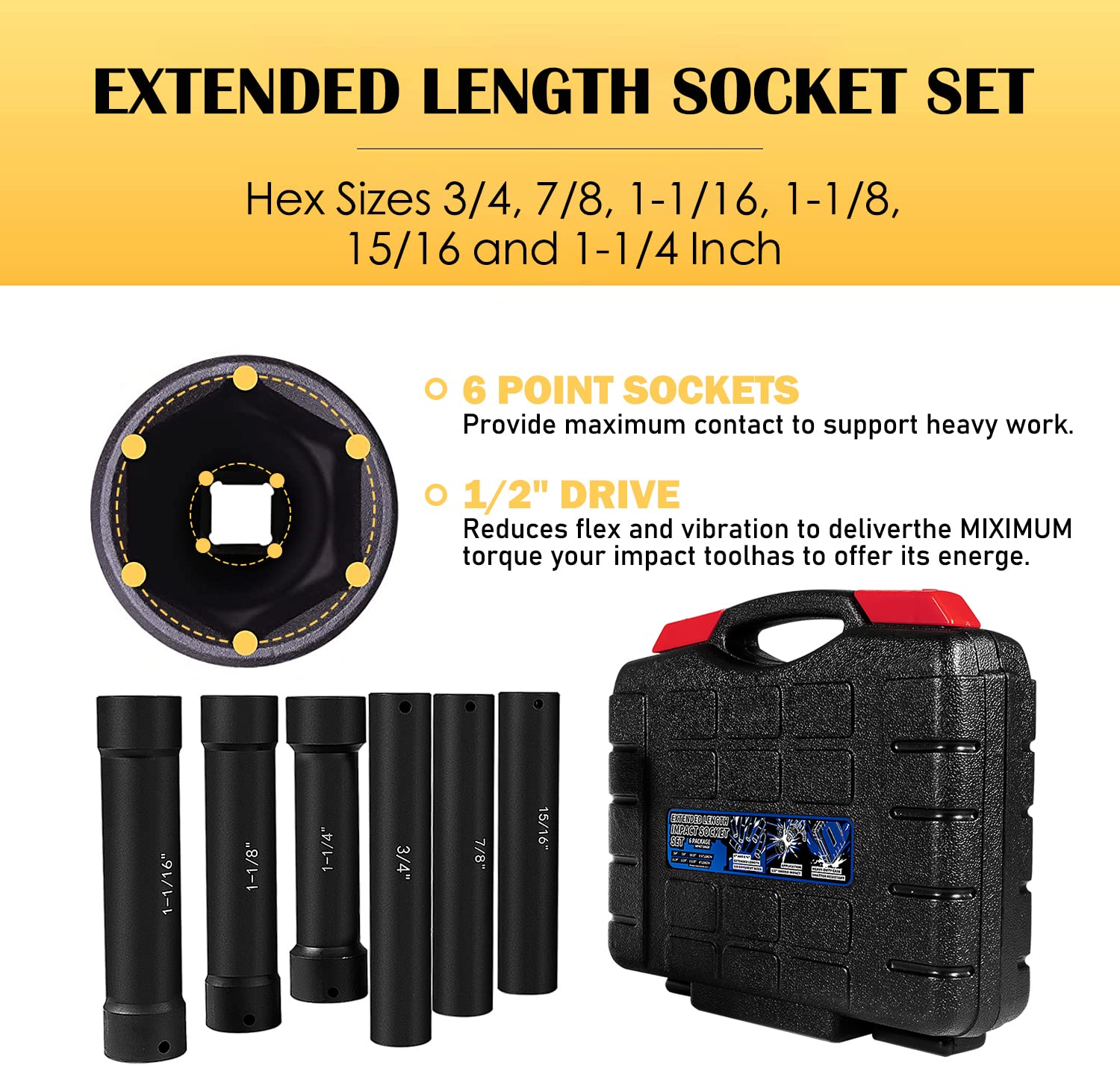 1/2 Inch Drive Extended Length Impact Socket Set 6 Sizes - Hex Sizes 3/4", 7/8", 15/16", 1-1/16”, 1-1/8", 1-1/4"Extra-Deep Length Extra-Deep Impact Set Heavy Duty with Case