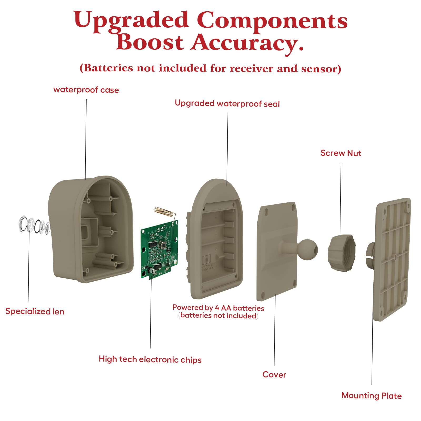 - EXCELLENT QUALITY - Outdoor driveway alert sensor system is made with industrial grade PVC housing, rubberized weather/water resistant seal, and a sunshade. Power on the sensor with 4pcs AA 1.5V AA batteries(not included in the package) and turn on the receiver with the cable or AA batteries. After the batteries are inserted, the power of the sensor can last for about one year, which is very durable.