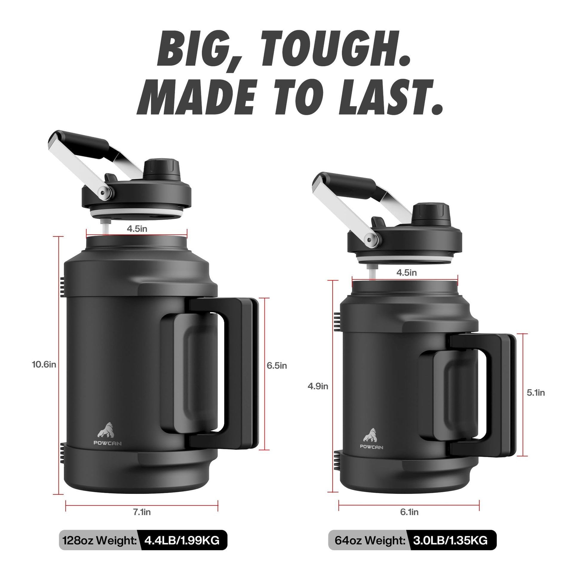 - Stay Cold, Stay Cozy: POWCAN's 128 oz stainless steel water jug keeps drinks ice-cold for 48 hrs or warm for 12, all without any sweating; Whether cycling or at the gym, it ensures hydration that lasts as long as you do