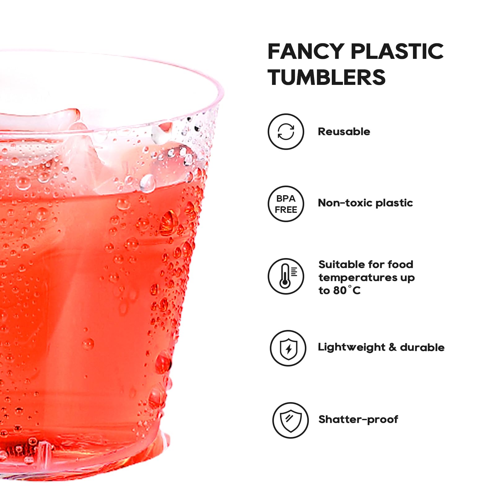 - CLEAR DESIGN: This elegant 1oz disposable wine glass is the perfect way to add color to your party, event, or home. These wine glasses, made of clear plastic, brilliantly reflect the bright colors of drinks, desserts, fruits, and other delicacies.