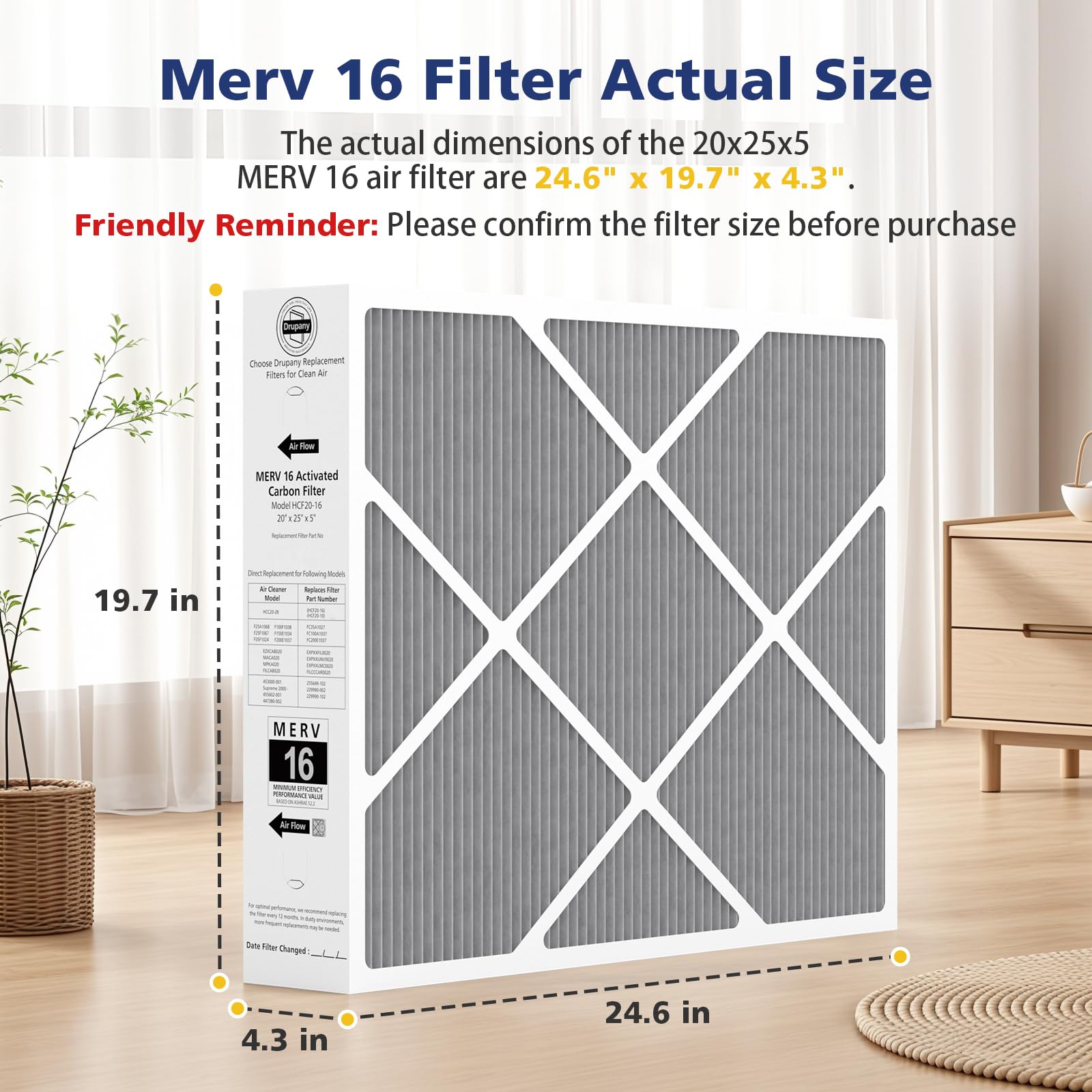 Details: 20x25x5 Filter Actual Size: The actual dimensions of the 20x25x5 MERV 16 air filter are 24.6" x 19.7" x 4.3". Please confirm that the filter size you need is correct before purchasing.The 20x25x5 MERV 16 air filter is perfectly compatible with following air cleaner models:Compatible with Lennox Model: HCC20-28, Replaces Filter Part Number: (HCF20-16) X6673(HCF20-10)Compatible with Honeywell Model: F25A1068, F25F1067, F35F1024, F100F1038, F150E1034, F200E1037, Replaces Filter Part Number: FC35A1027, FC100A1037, FC200E1037Compatible with Carrier Model: EZXCAB020, MACA020, MPKA020, FILCAB020, Replaces Filter Part Number:EXPXXFIL0020, EXPXXUNV0020, EXPXXLMC0020, FILCCCAR0020Compatible with Trion Air Bear Model: 453000-001, Supreme 2000, 455602-001, 447380-002, Replaces Filter Part Number: 255649-102, 229990-002, 229990-102MERV 16 High Efficiency Filtration: It can effectively filter 99.99% of airborne particles as small as 0.1 microns, improving the air quality in your home or office.Material: Made of coconut-activated and carbon coated fiber matrix material.Replacement Cycle: The filter has a lifespan of up to 1 year. It is recommended to replace it every 6-12 months based on your usage and environment conditions.Package Include:1 Pack 20x25x5 Furnace Filter