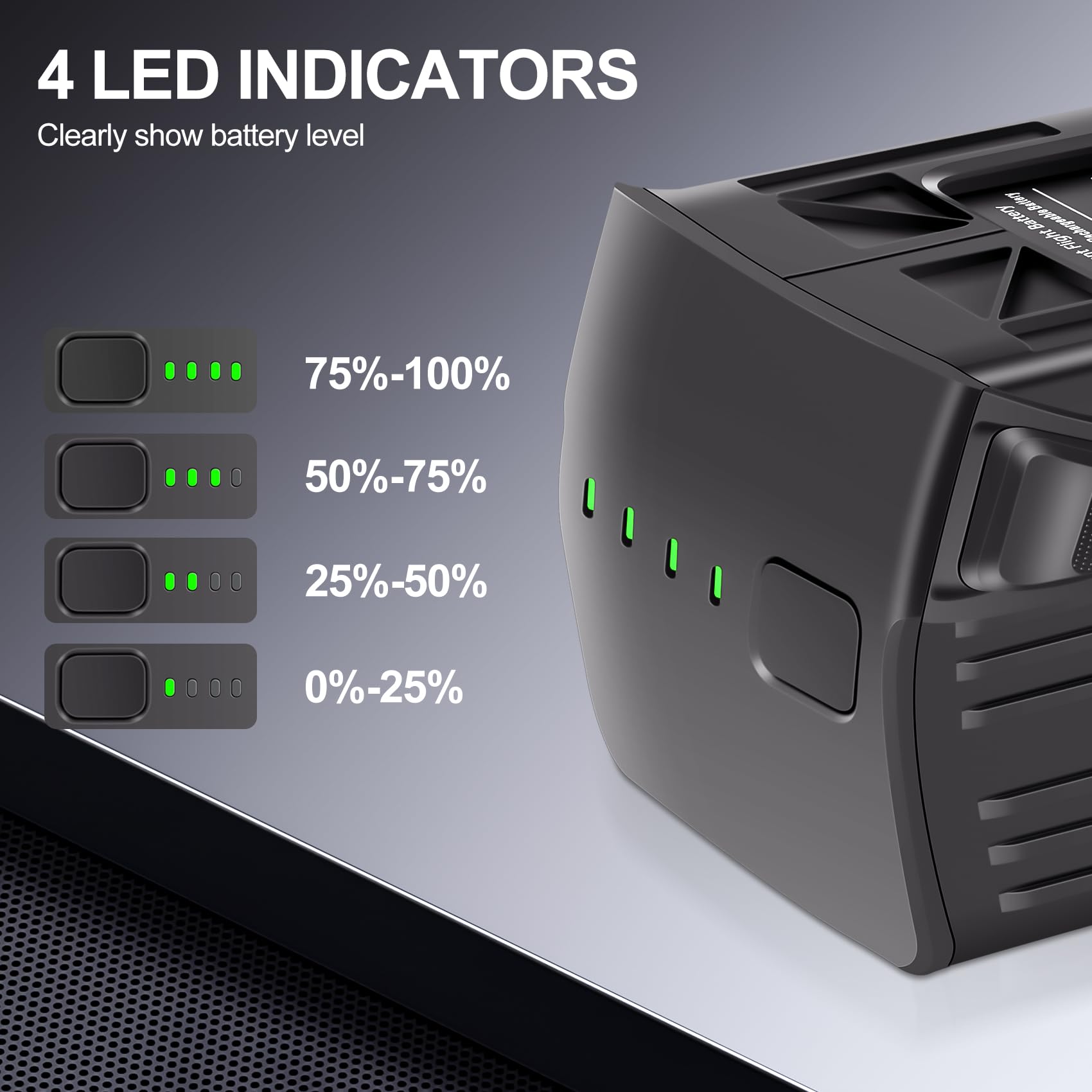 - 【Mavic 3 Battery LED Indicator】: Each Mavic 3 battery has 4 LEDs that show real-time power at the push of a button. One LED indicates 0-25% power level, two indicators indicate 25%-50% power level, three indicators indicate 50%-75% power level, and four indicators indicate 75%-100% power level.