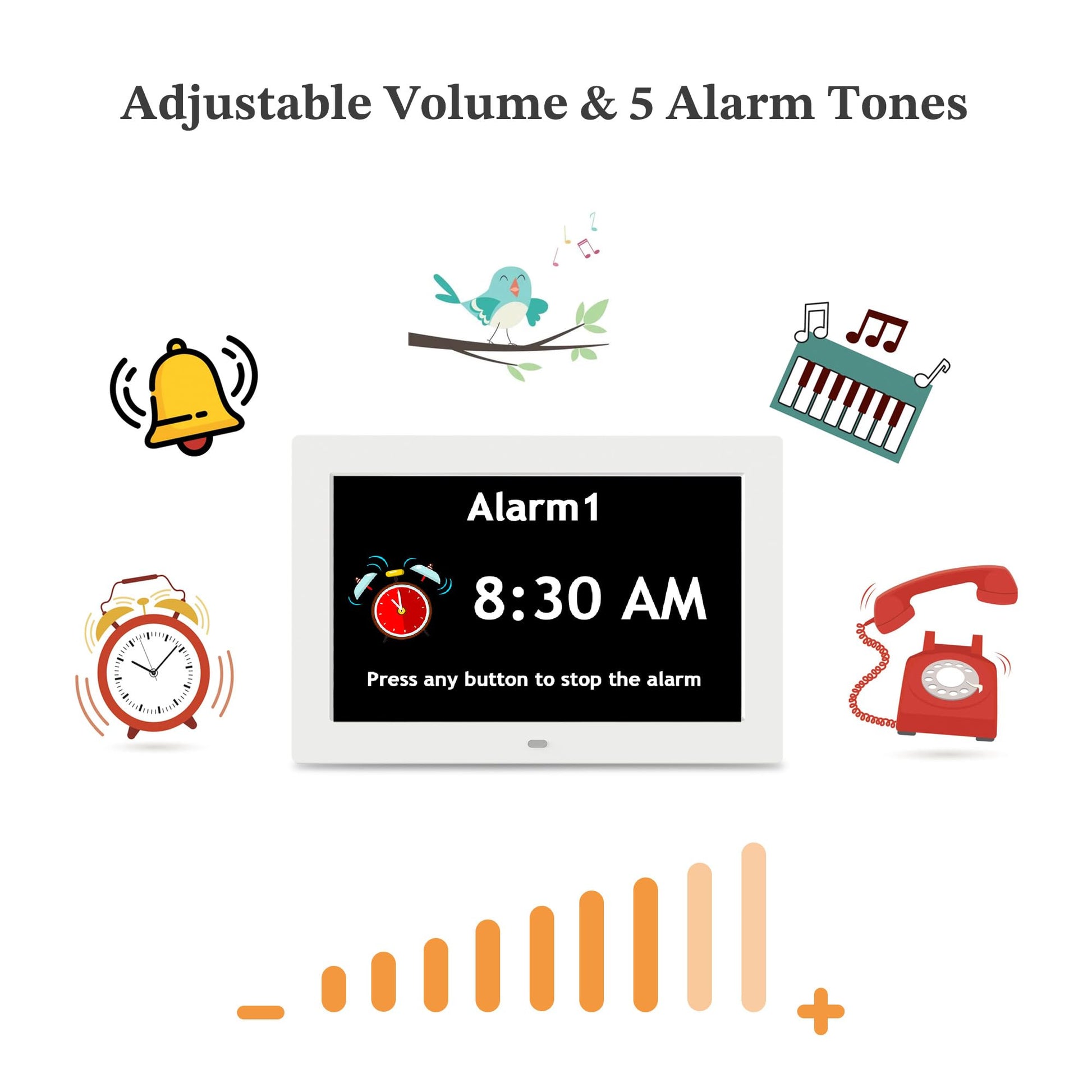 - Easy Alarm & Reminder Setting; This digital alarm clock features 10 customizable reminders and 6 programmable alarms, offering 5 soft tones and 5 volume levels. The reminders are also set with visual icons of essential daily activities like medication, hydration, and walking, making this clock a perfect elderly assistance product, especially friendly to patients with Alzheimer's or dementia. This digital clock with reminders will greatly help them easily organize daily activities