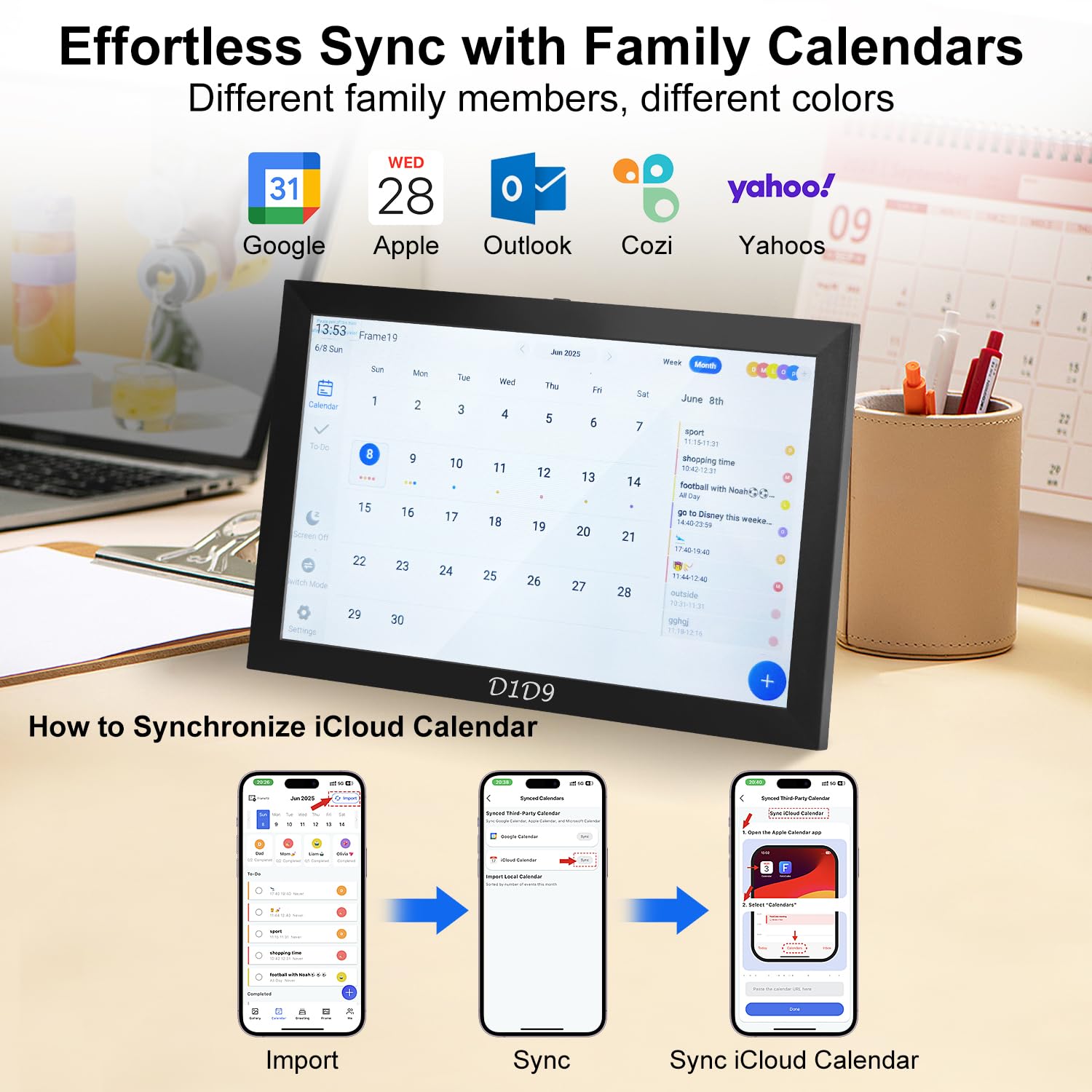 - 【Smart Sync】: Effortlessly sync Google, iCloud, Outlook, Cozi, Yahoos and more via our free App :FotoCube (view and add events in vibrant HD clarity). How to Synchronize iCloud Calendar: 1. Click the import button; 2. Then click on “Sync” on the iCloud Calendar; 3. Sync iCloud Calendar. (Please refer to the instruction manual for detailed steps.)