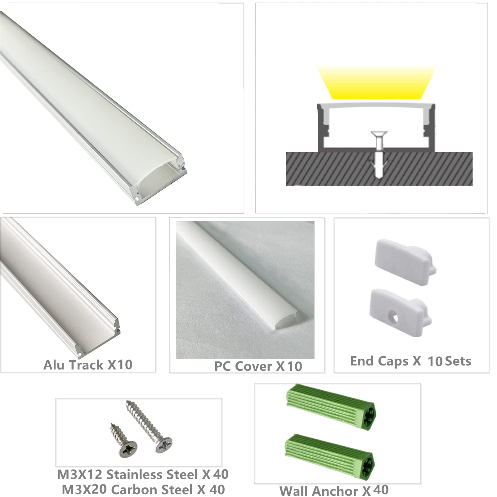 10-Pack Pre-Drilled Countersunk Hole 3.3FT LED Strip U Channel Diffuser, Hacksaw Easy Cut Tight and Flush Mounted Under Cabinet Tape Light Aluminum Low Profile with Screw and End caps (10)