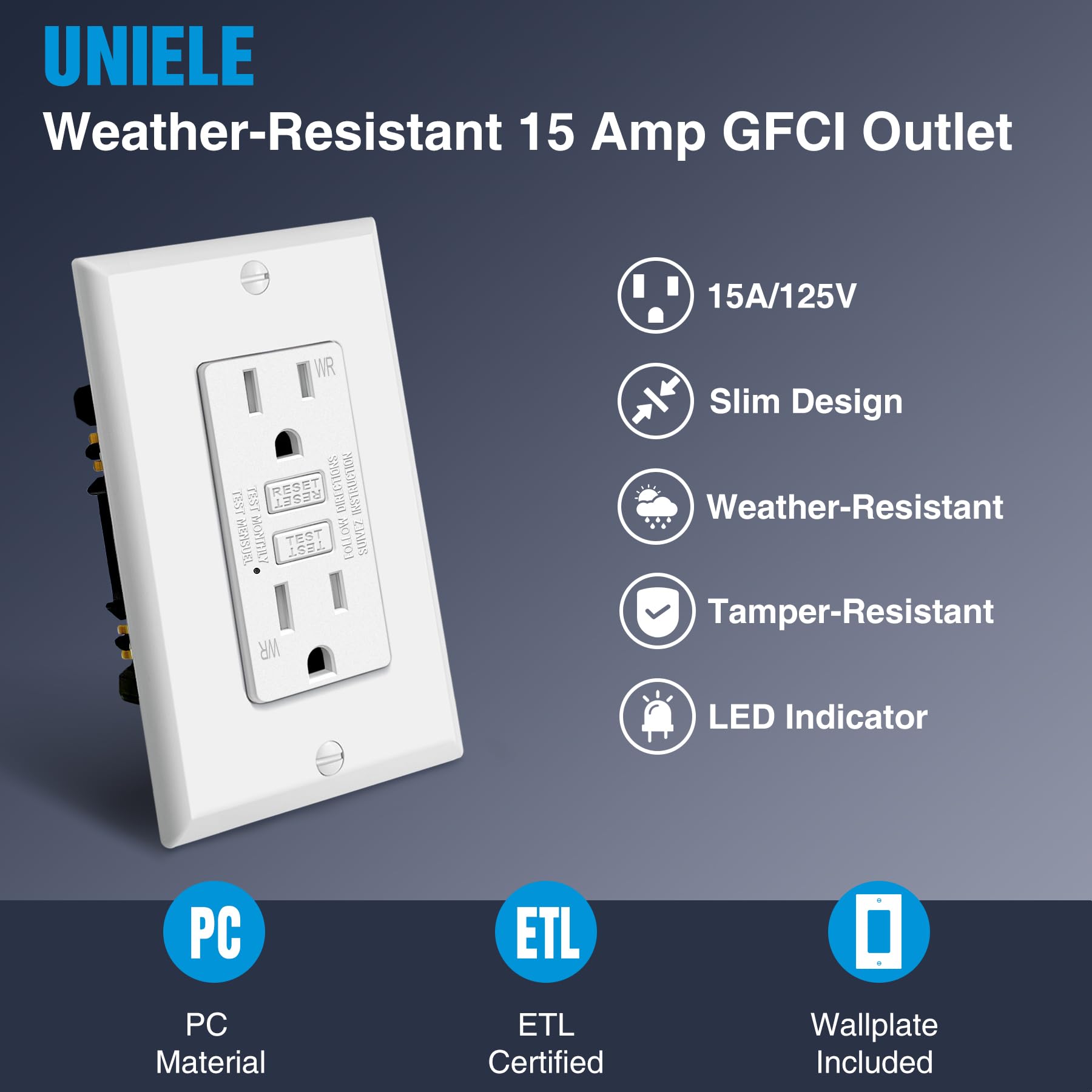 (10 Pack) UNIELE 15 Amp WR GFCI Outlet, Outdoor Weather-Resistant GFI Receptacle, Ground Fault Circuit Interrupter, Wallplate Included, White
