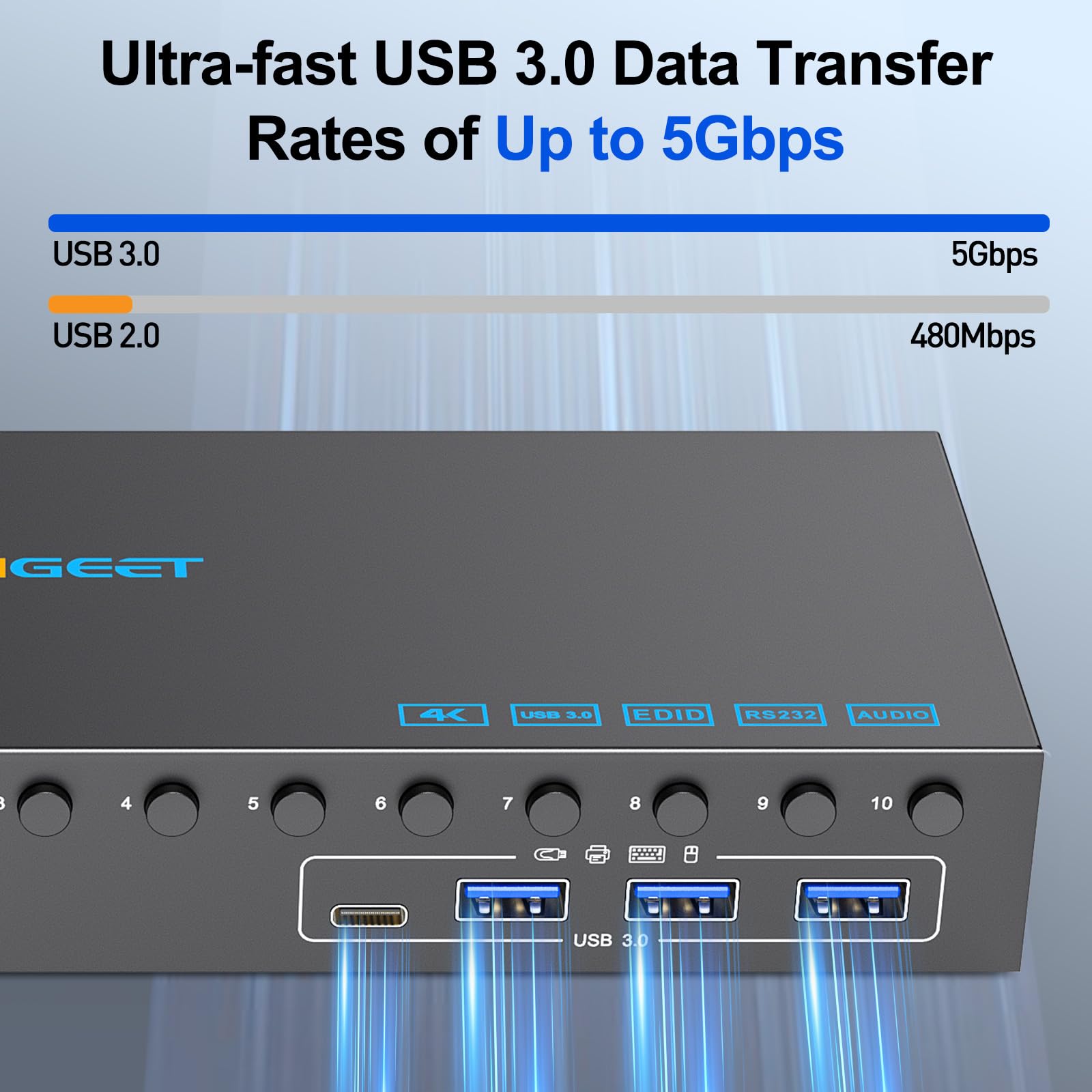 10 Port 8 Port HDMI KVM Switch 4K@60Hz EDID Simulation, USB3.0 KVM Switch HDMI for 10 Computers Share 1 Monitor and 4 USB Devices, KVM Switches with Audio RS232 Wired Remote 12V Power and USB Cable