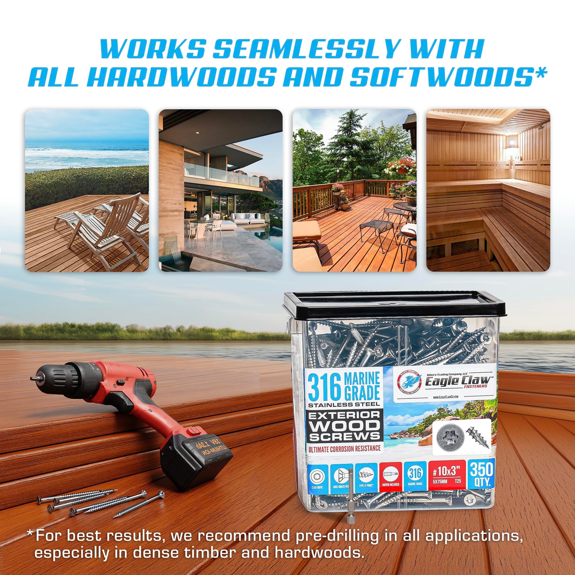 #10 x 3 Inch 316 Stainless Steel Screws Marine Grade (350 Pack, T25 Star) | Stainless Steel Wood Screws w/Driver Bit by Eagle Claw Fasteners | High Corrosion Resistance for Coastal Construction