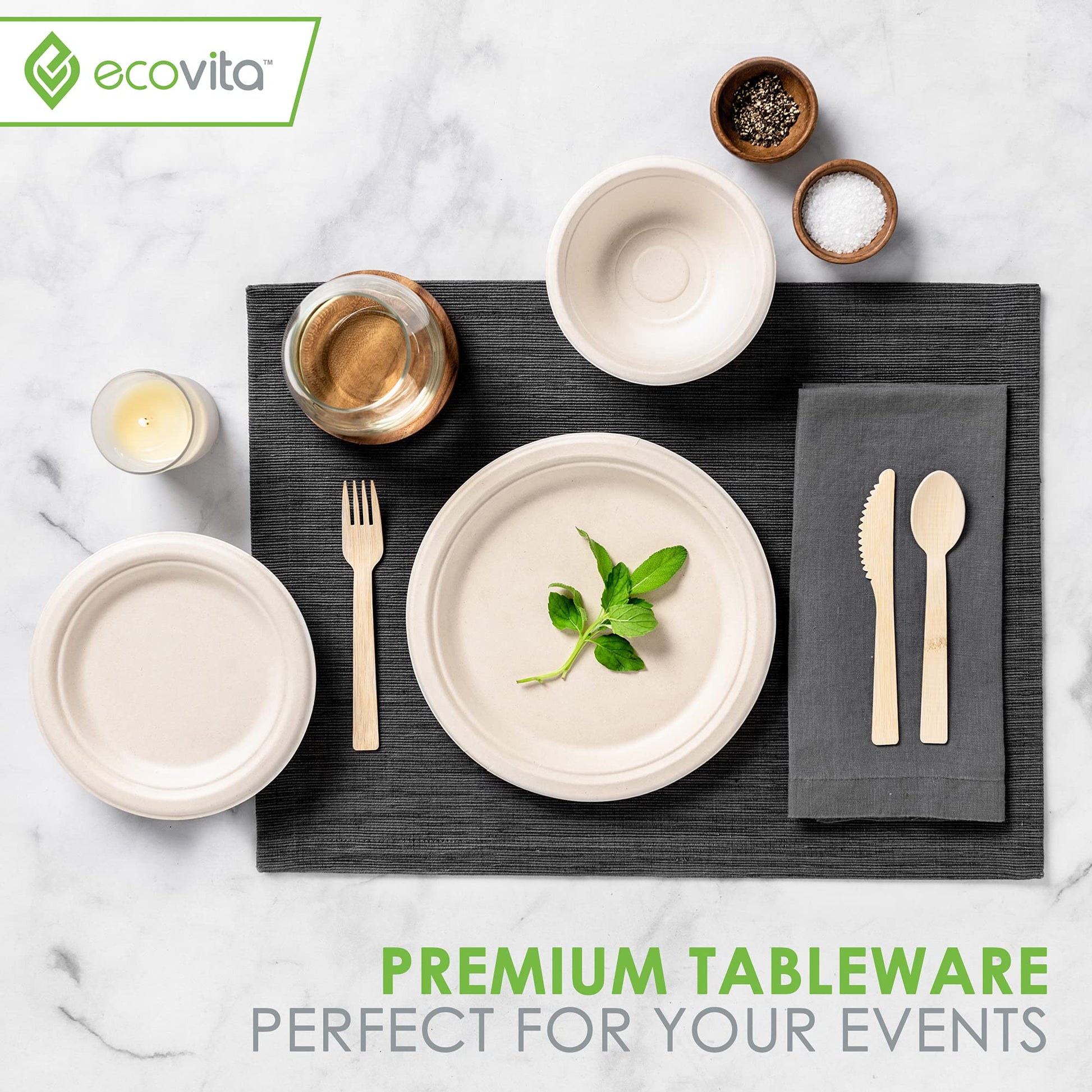 Details: Compostable tableware under the appropriate conditions will turn into compost in 2 - 4 months, not years! Bagasse (sugarcane) and Bamboo are renewable and sustainable resources which can be replaced in months not years! Feel good about protecting the environment and providing your party guests with premium 100% compostable plates. Provide your kids lunches or meals with all natural non-toxic nonplastic TREE FREE tableware. Ecovita provides premium ecofriendly products and peace of mind that you are providing all-natural tableware for your family and friends. Perfect for Camping, Picnics, Lunches, Catering, BBQs, Events, Parties, Weddings and Restaurants. We believe you will be totally satisfied by our safe, environmentally friendly products. We will gladly back all our products with a 60-day Money Back Guarantee from date of purchase!