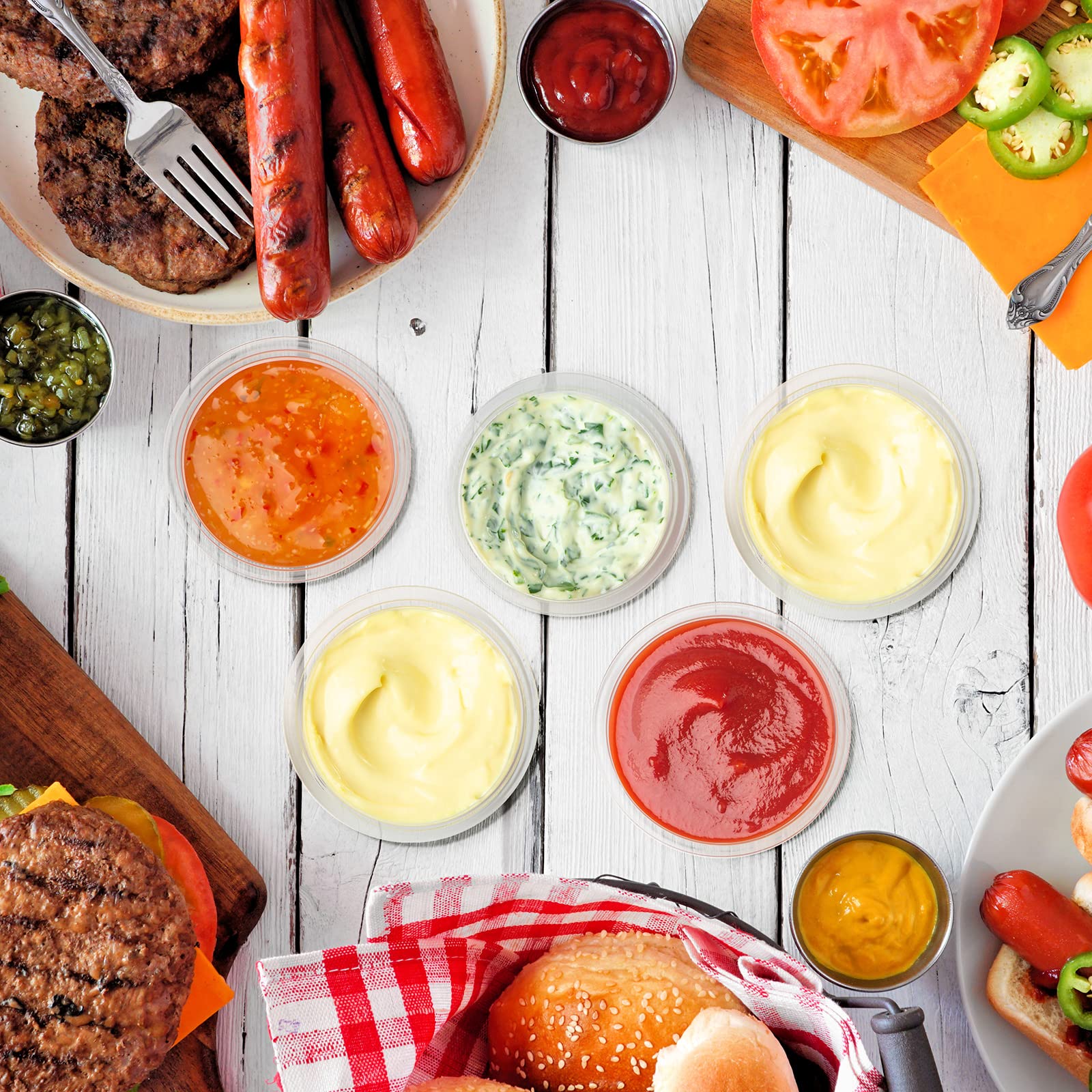 - Clear Plastic Condiment Cups: the condiment cups with lids are nice for displaying your signature sauces, coleslaw or household condiments; This cup with clear lid makes it easy to identify the contents while keeping the contents clean
