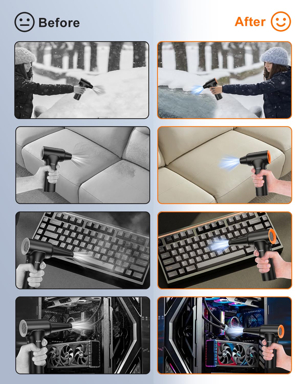 - Super Power Air Duster: YEAHCO 2025 updated electric air duster adopts the speed of 300000 RPM brushless motor, delivering strong wind speed exceeding 120m/s,wind pressure 300G.The powerful wind force can clean up debris and dust on various devices easily. This cleaning tool perfect for a wide range of tasks, like daily dusting, drying, removing car water or snow