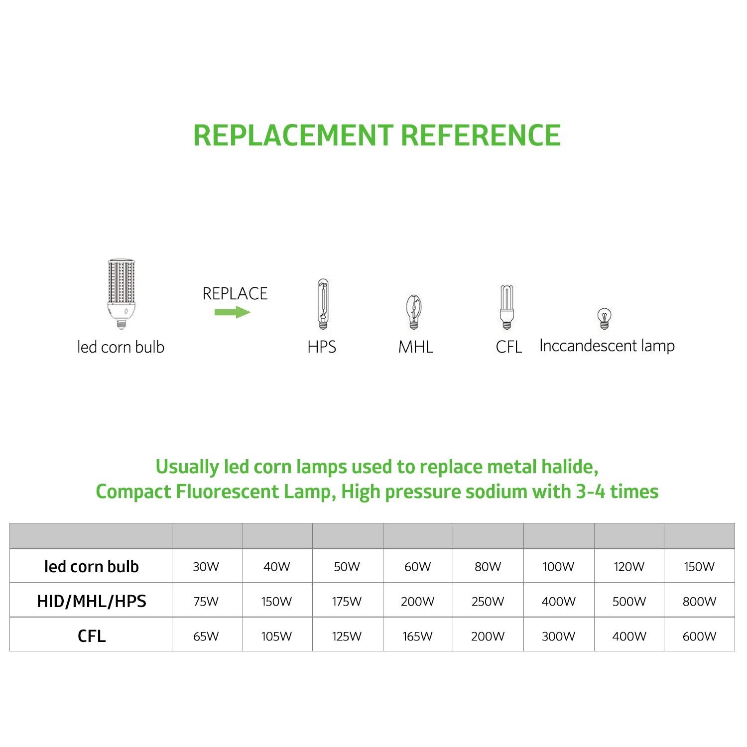 - Super bright:100W LED corn light produce up to 13000 Lumens,Led retrofit 165-200w Fluorescent bulb.Led replacement 400w MH lamp HID HPS bulb.Conventional Standard size old light bulb,single light bulb,regular light bulb,Old Light Fixture,With E26 E27 Medium Screw Socket or E39 E40 Large Mogul Base