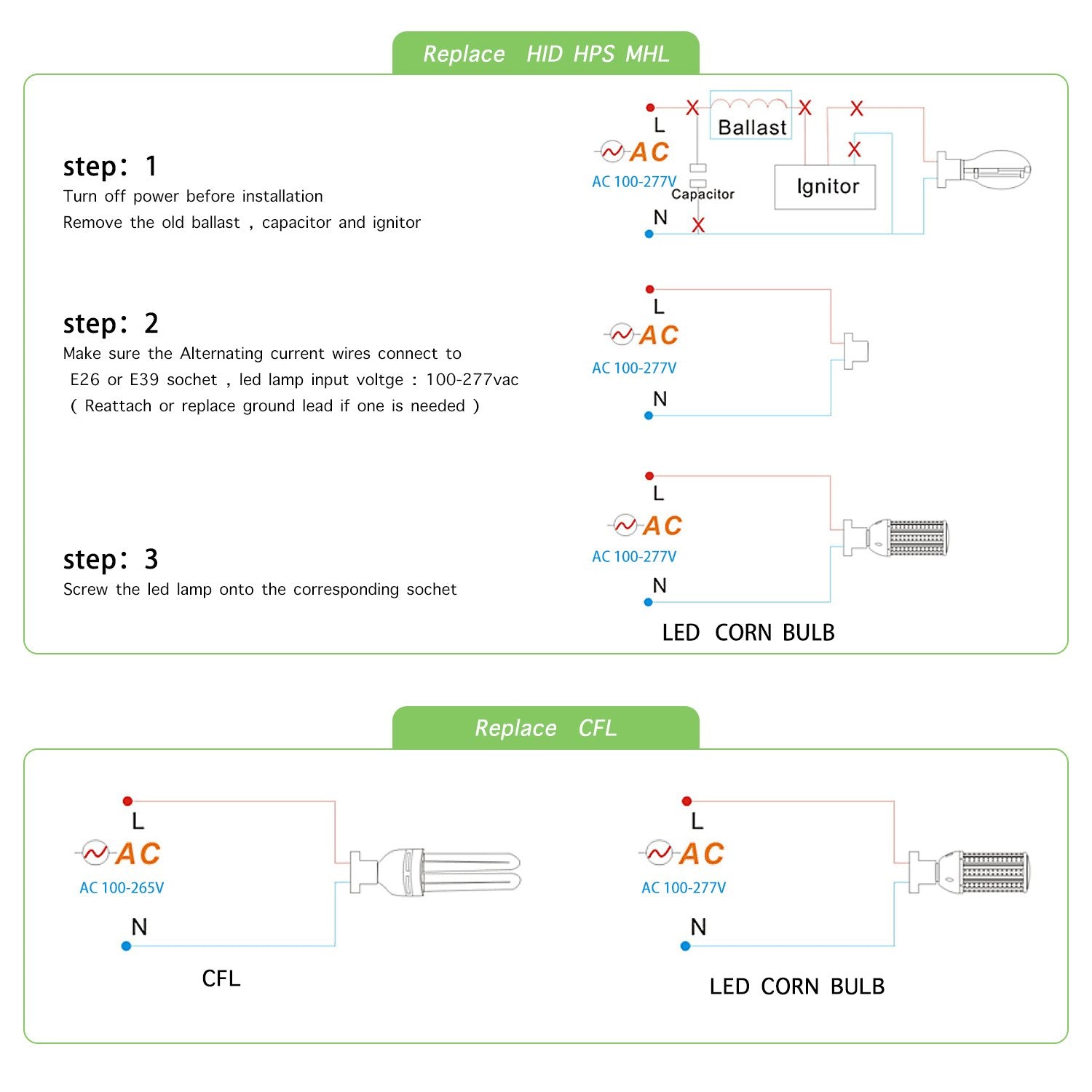 - Wide Application:100W Led corn light bulb Working voltage:AC100-277V Great for indoor outdoor Street and large Area Light,garage light,warehouse light barn light,Parking Lot High Bay light patio courtyard garden light shop light work light celling light grow light wall pack Post Top,acorn,low bay shoebox Light fixture etc,Anywhere need bright light with LED replacement bulbs or LED retrofit kits