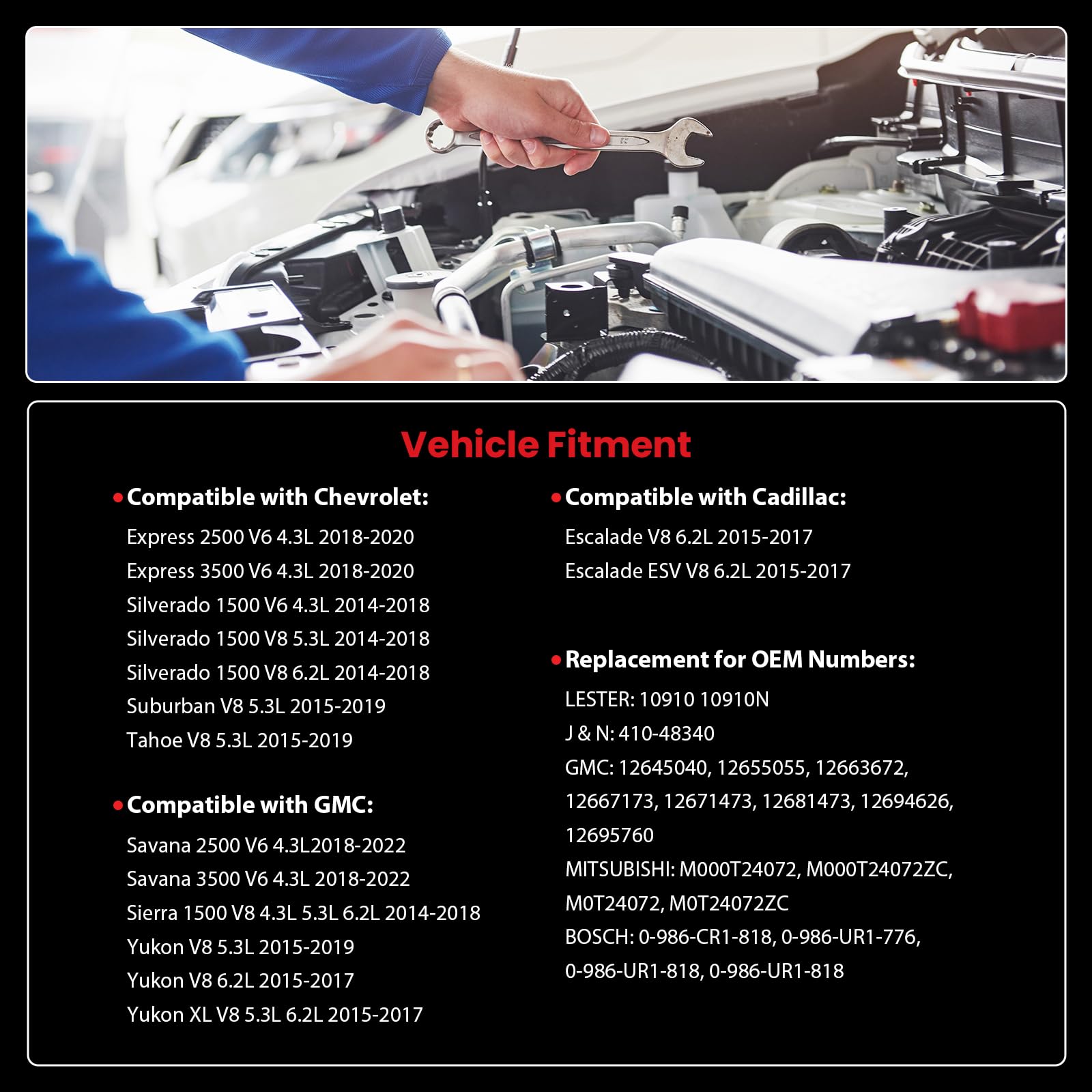 - [Direct Fitment]: 10910N Starter Compatible with CHEVROLET:Express 2500 v6 2018-2019; Express 3500 V6 2018-2020; Silverado 1500 V6/v8 2014-2018; Suburban V8 2015-2019;Tahoe V8 5.3L 2015-2019; Compatible with CADILLAC:Escalade V8 2015-2019;Escalade ESV V8 2015-2019; Compatible with GMC:Savana 2500 V6 2018-2022;Savana 3500 V6 2018-2022;Sierra 1500 V8 2014-2018;Yukon V8 2015-2019; Yukon V8 2015-2017;Yukon XL V8 2015-2017.