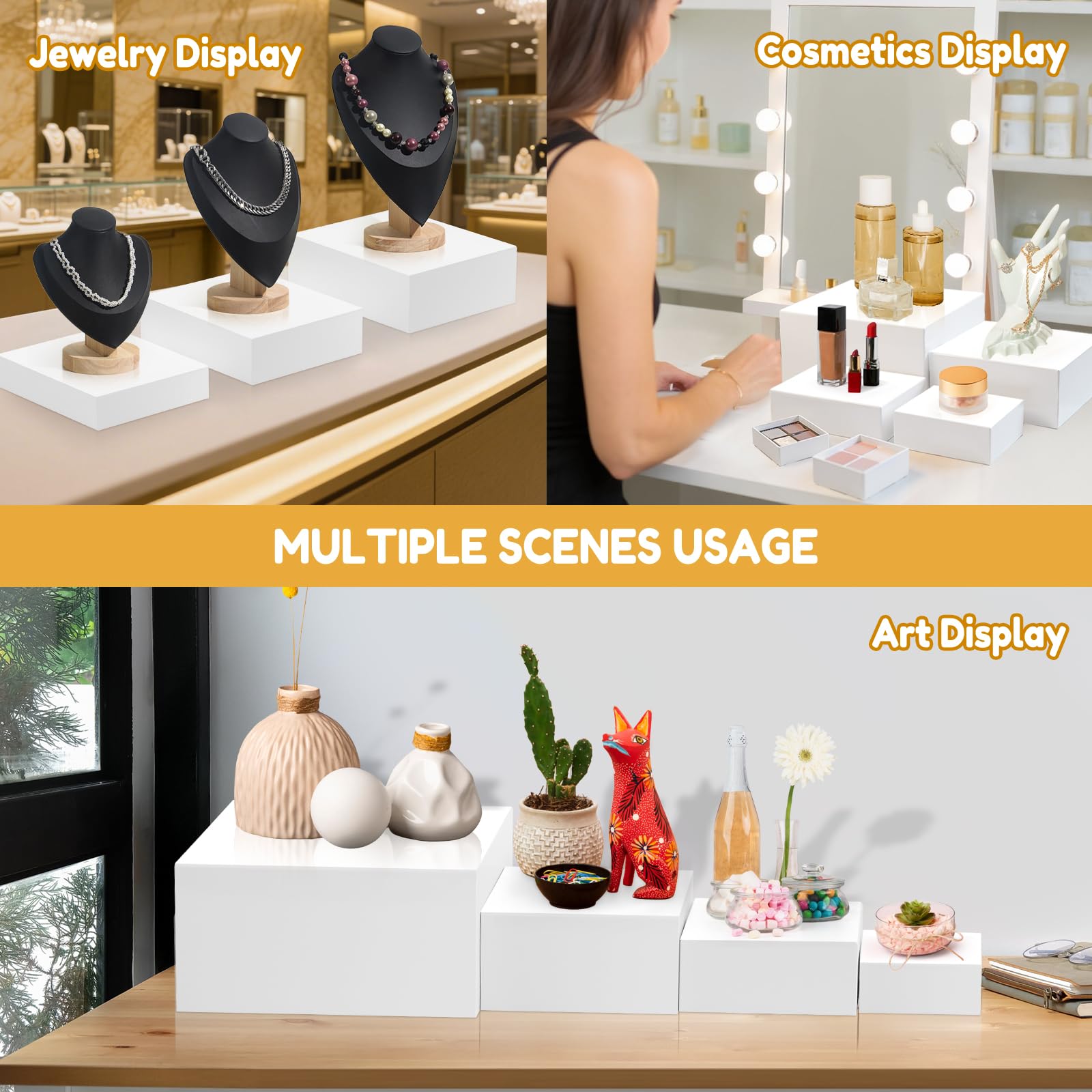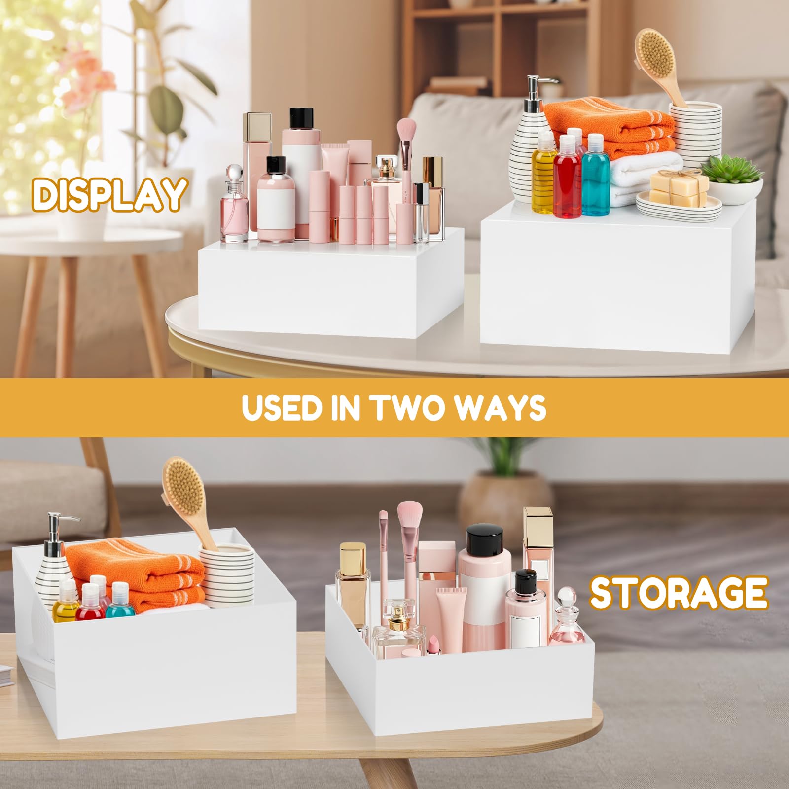 - MULTI-PURPOSE ACRYLIC CUBE BOXES: Beyond dessert displays, these acrylic buffet risers are also ideal for artworks, crafts, jewelry collections, cosmetics, and decorative items. The hollow base design allows for easy stacking and nesting, while the compartment can as practical storage