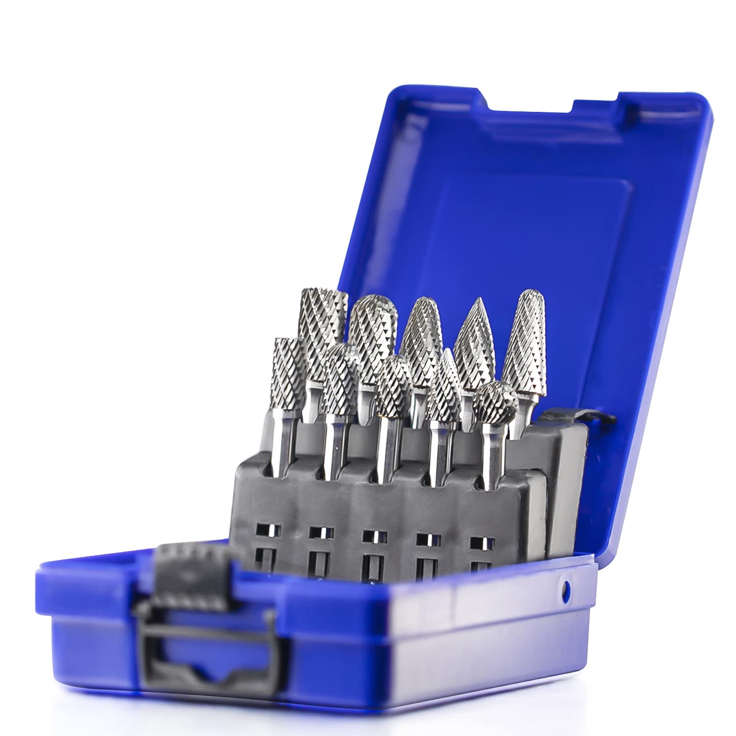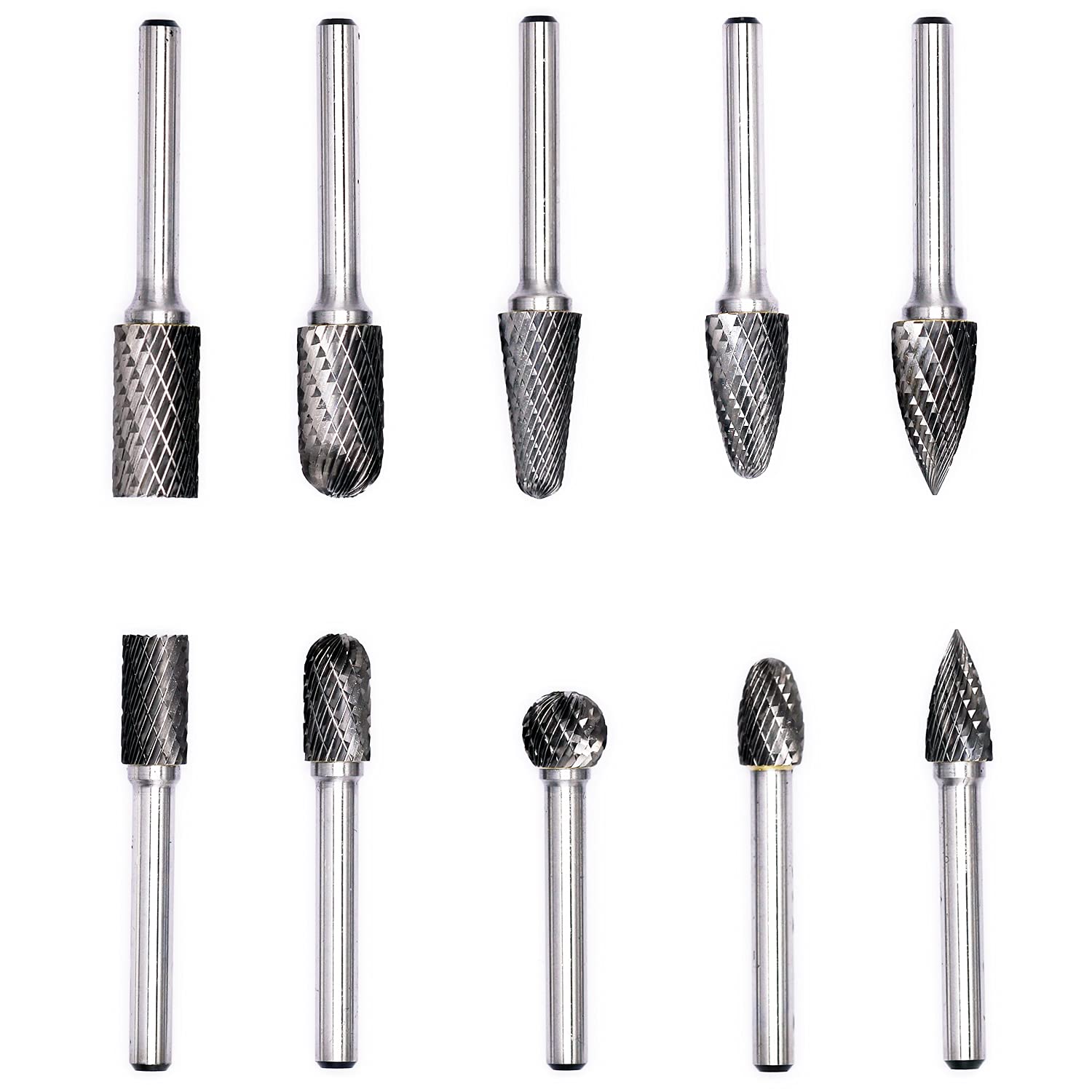 10pcs Carbide Burrs Set with 1/4'' Shank Double Cut Solid Power Tools Tungsten Carbide Rotary Files Bits for Die Grinder Metal Wood Carving Engraving Polishing Drilling Grinding Milling Cutting