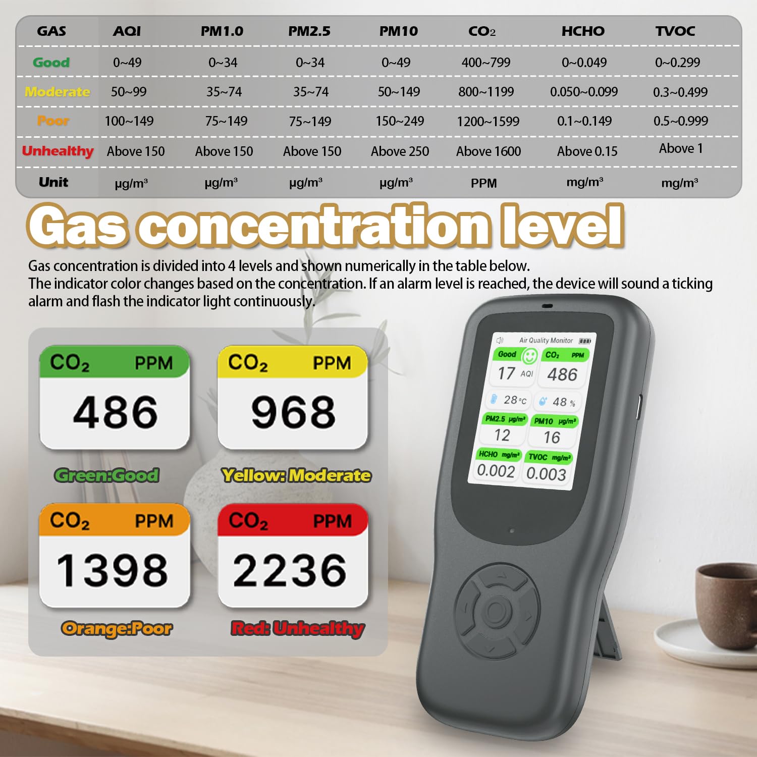 - 【Color & Sound Dual Alarm Systems】Built-in color-coded icons (Green for Good ▶ Yellow Moderate ▶ Orange Poor ▶ Red Unhealthy) and a loud ticking alarm notify you the moment any gas threshold is exceeded. The flashing light and screen color change help you take action fast to improve indoor air quality.