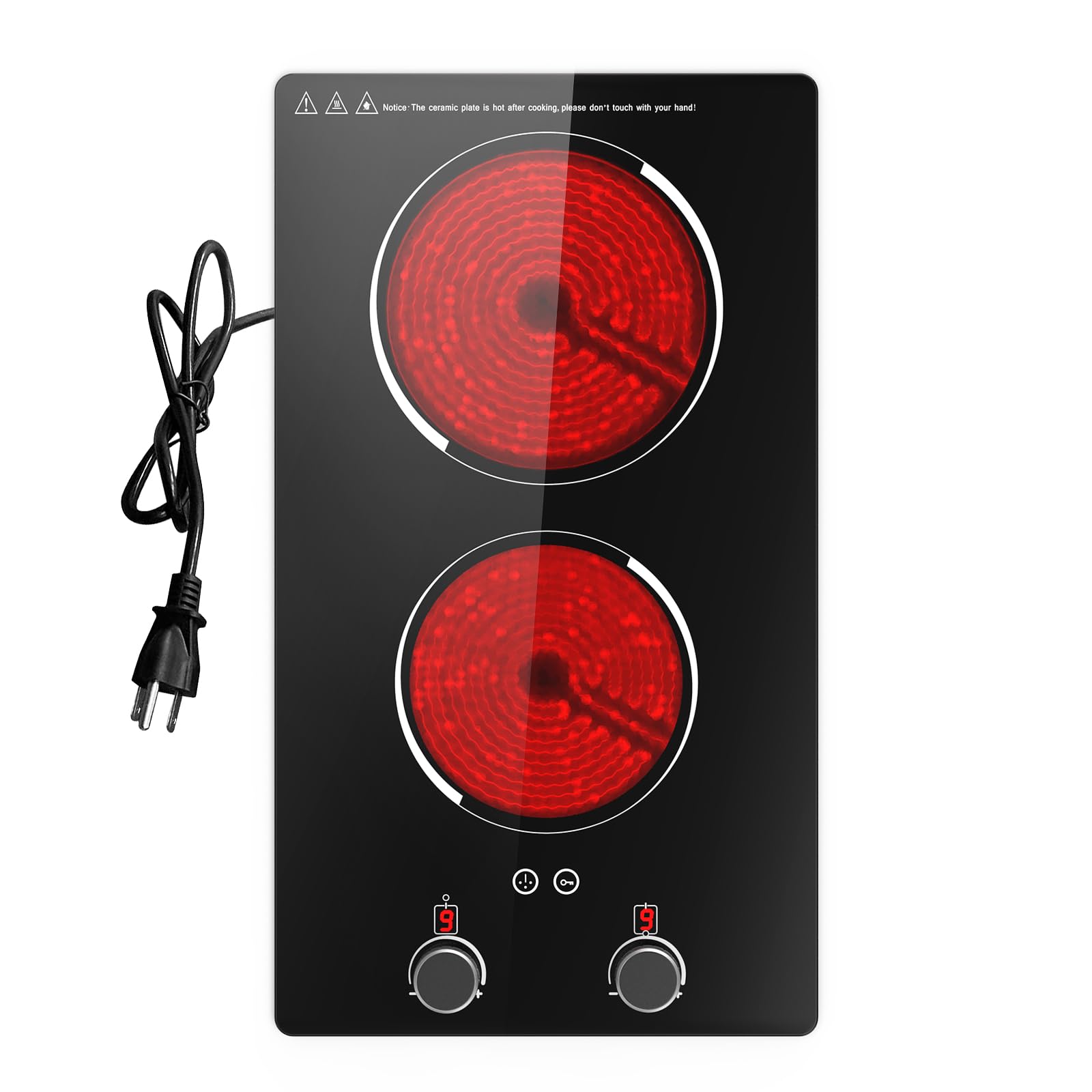 - Knob Control, Easy to Use:This 120 volt cooktop is operated by knob, it hasn't any complicated function buttons, knob control electric cooktop is very simple to use, perfectly for the elderly or people with poor eyesight. Once powered on, the electric ceramic cooktop can be heated by gently twisting the knob, and the electric cooktop 2 burners has 10 heating levels to meet the needs of any food at different temperatures.