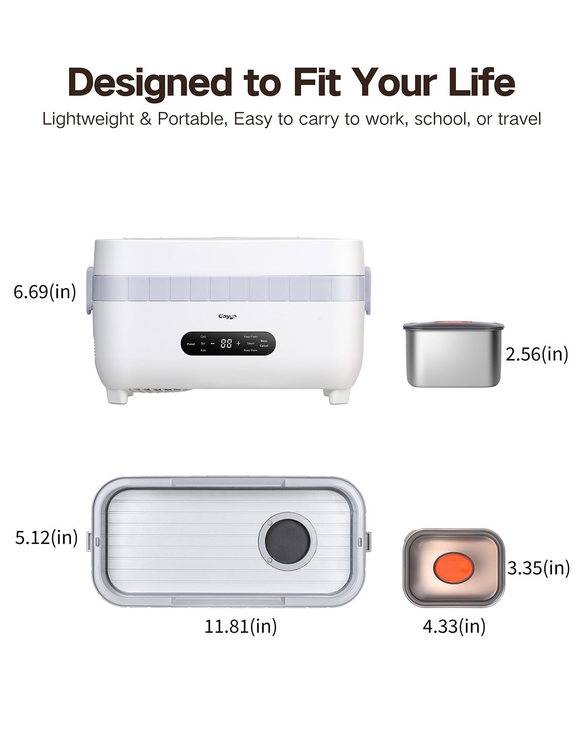 - 【Steam-Driven Heating & Cooking】Reheat or cook meals anywhere with this electric heated lunch box’s advanced steam system that delivers fast, even heating in just 20 minutes. From warming leftovers to steaming rice, veggies, eggs, fish, or porridge from raw in 30 minutes, it’s your portable food warmer and compact steamer in one—perfect for office, job sites, or travel
