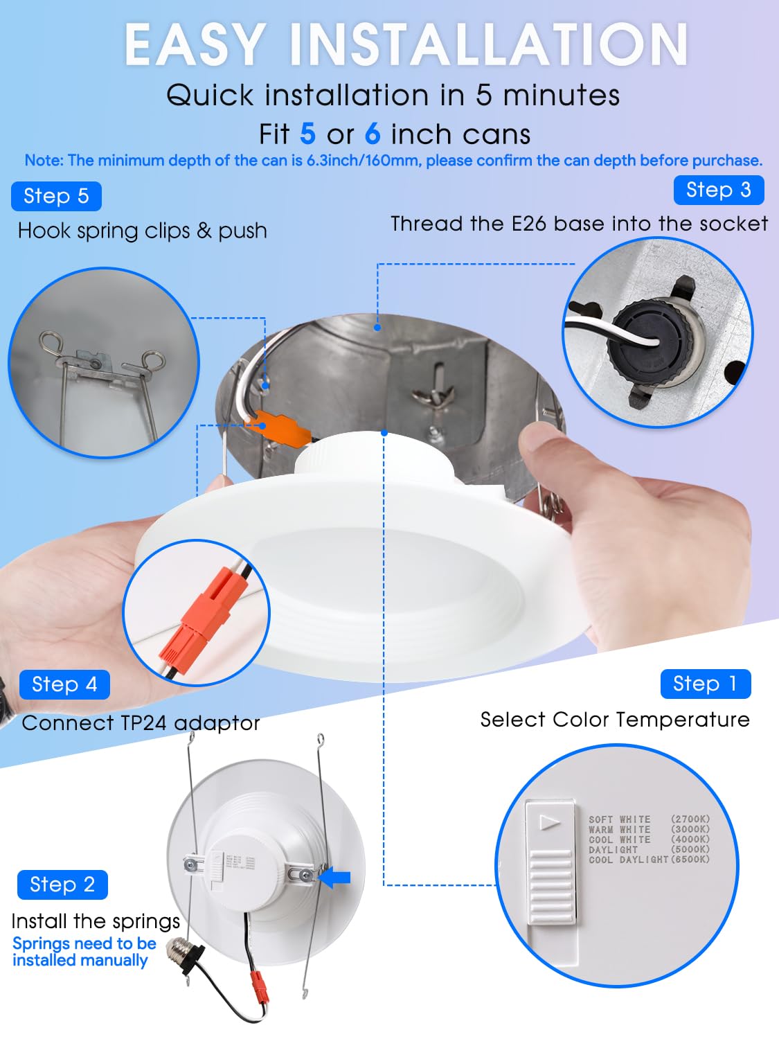 - 💡Easy Installation: Our retrofit LED downlights with a metal baffle trim, durable than plastic, no need to worry about damage. Universal E26 base, which is as simple to install as a light bulb and can be installed independently without the need for an electrician. Installing one only takes 5 minutes, save you time and money. Note: The minimum depth of the can is 6.3inch/160mm, please confirm your can depth before purchase. Springs need to be installed manually