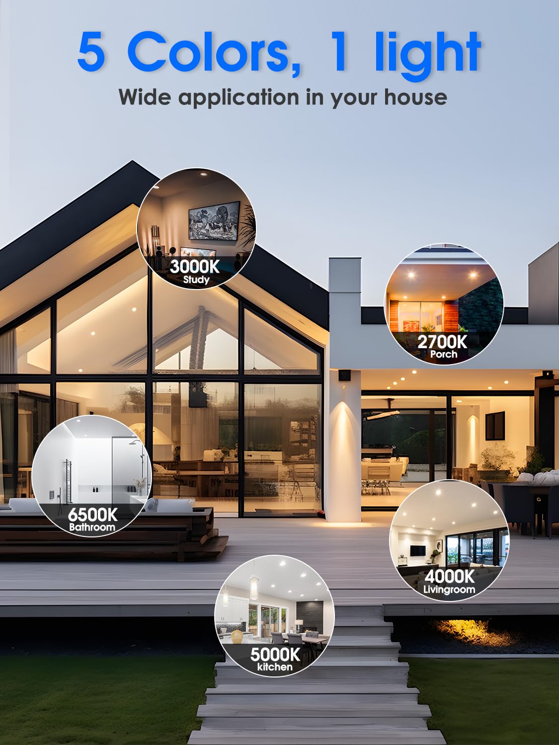 - 💡5 CCT-in-1: Our led can lights have 5 color temperature selectable, 2700K(soft white), 3000K(warm white), 4000K(cool white), 5000K(daylight), 6500K(cool daylight). No need to worry about what color temperature to buy, Our recessed lighting eliminates the hassle of returning or exchange products due to inappropriate color temperature