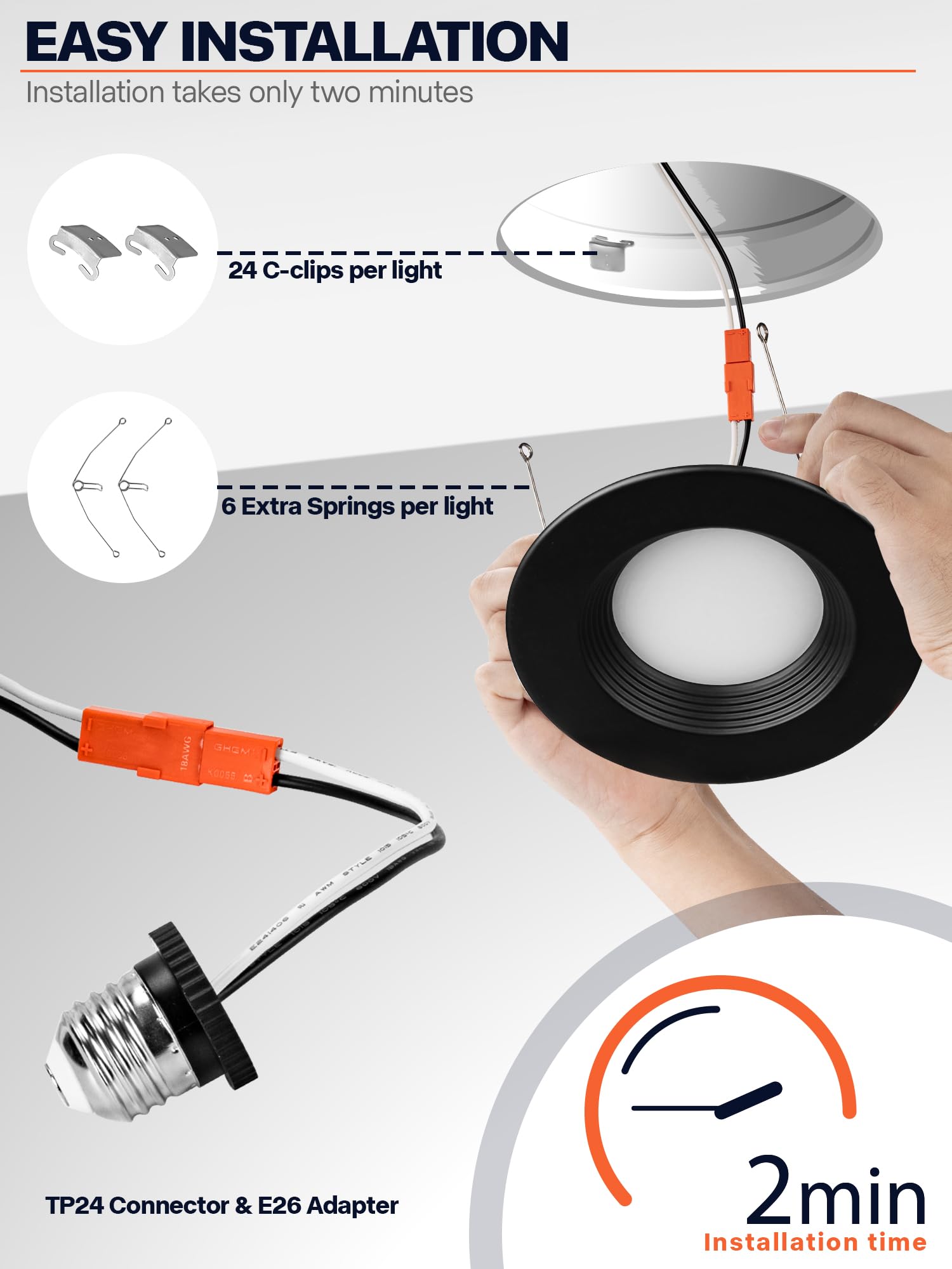 - 💡【Easy Install】 The retrofit LED recessed lighting no additional accessories are required. Instead of the traditional springs, they are ready to fit in 5/6 inch recessed housing cans with C clip. Standard E26 base allows you to easily screw into the can.