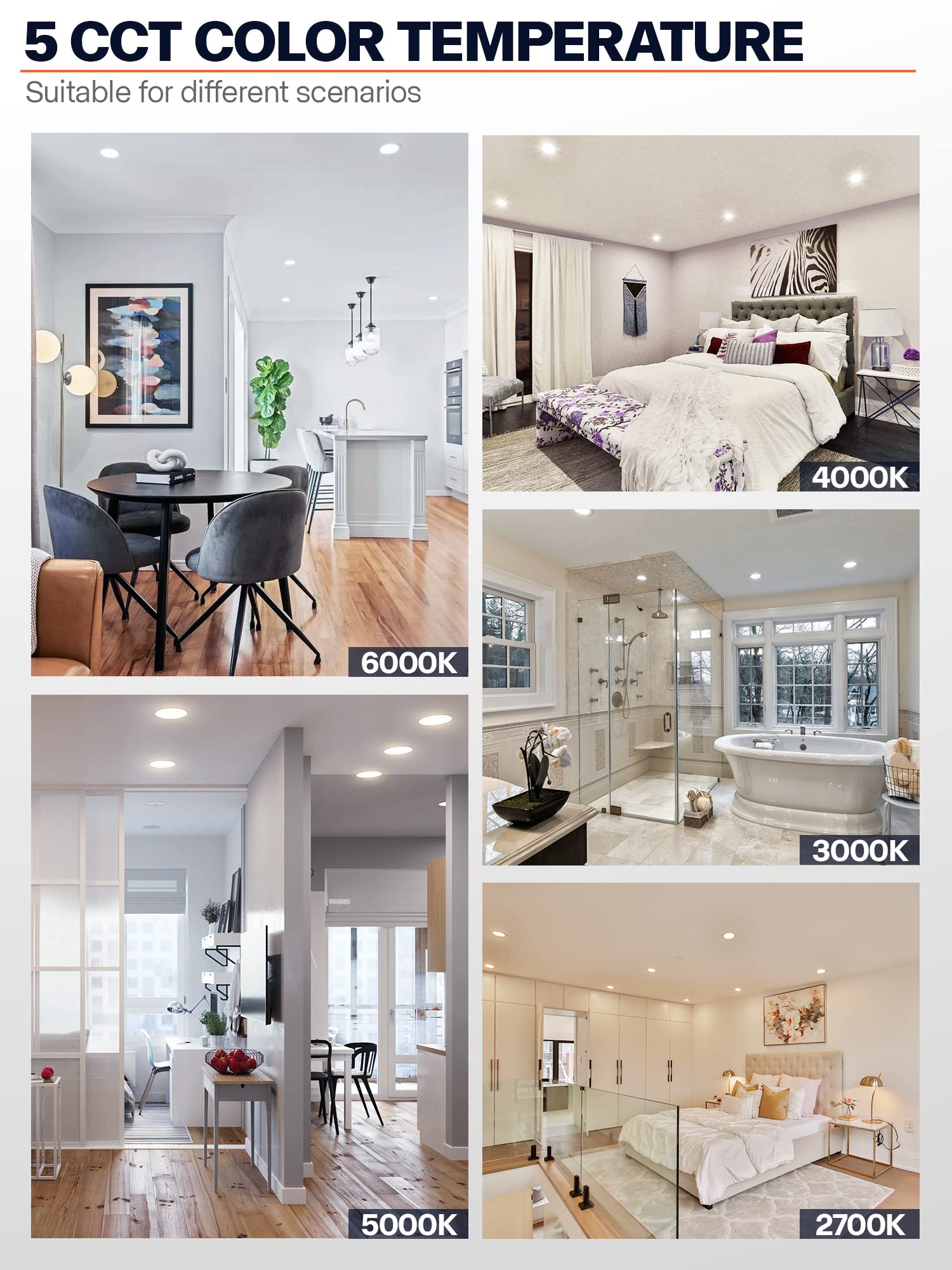 - 💡【Color Changing & Smooth Dimmability】 The Black retrofit LED recessed lighting 6 inch is dimmable, 2700K(Soft White), 3000K(Warm White), 4000K(Neutral White), 5000K(Cool White), 6000K(Daylight). 5-100% seamless and smooth dimming capabilities, compatible with most dimmers in the market.