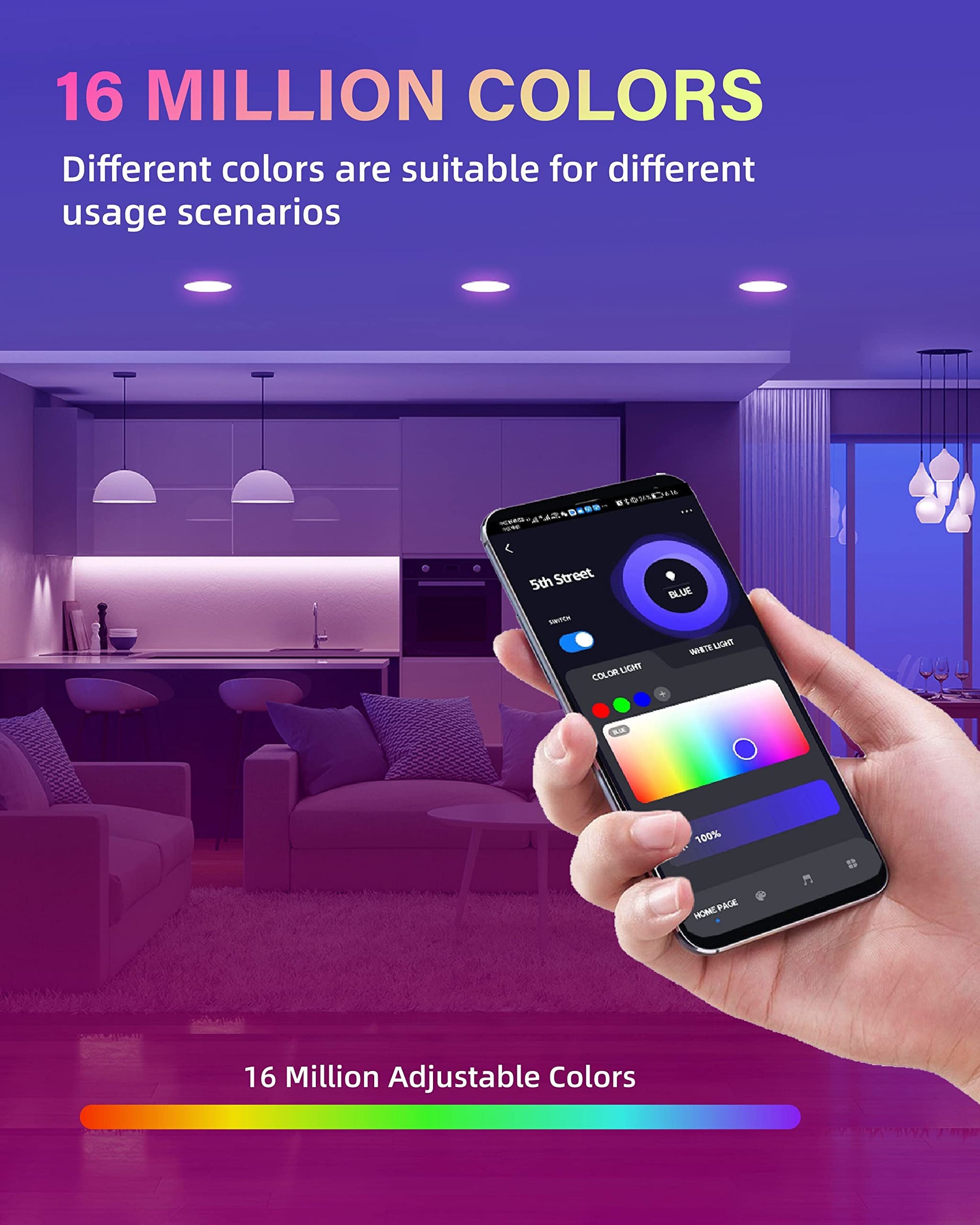 - 💡【Variety of Colors & Brightness】 The 6 inch smart recessed downlight supports warm white and cool white from 2700K to 6000K. Provide 16 million colors. 5%-100% brightness is adjustable. 8 scene modes, you can also DIY the scene modes you want.