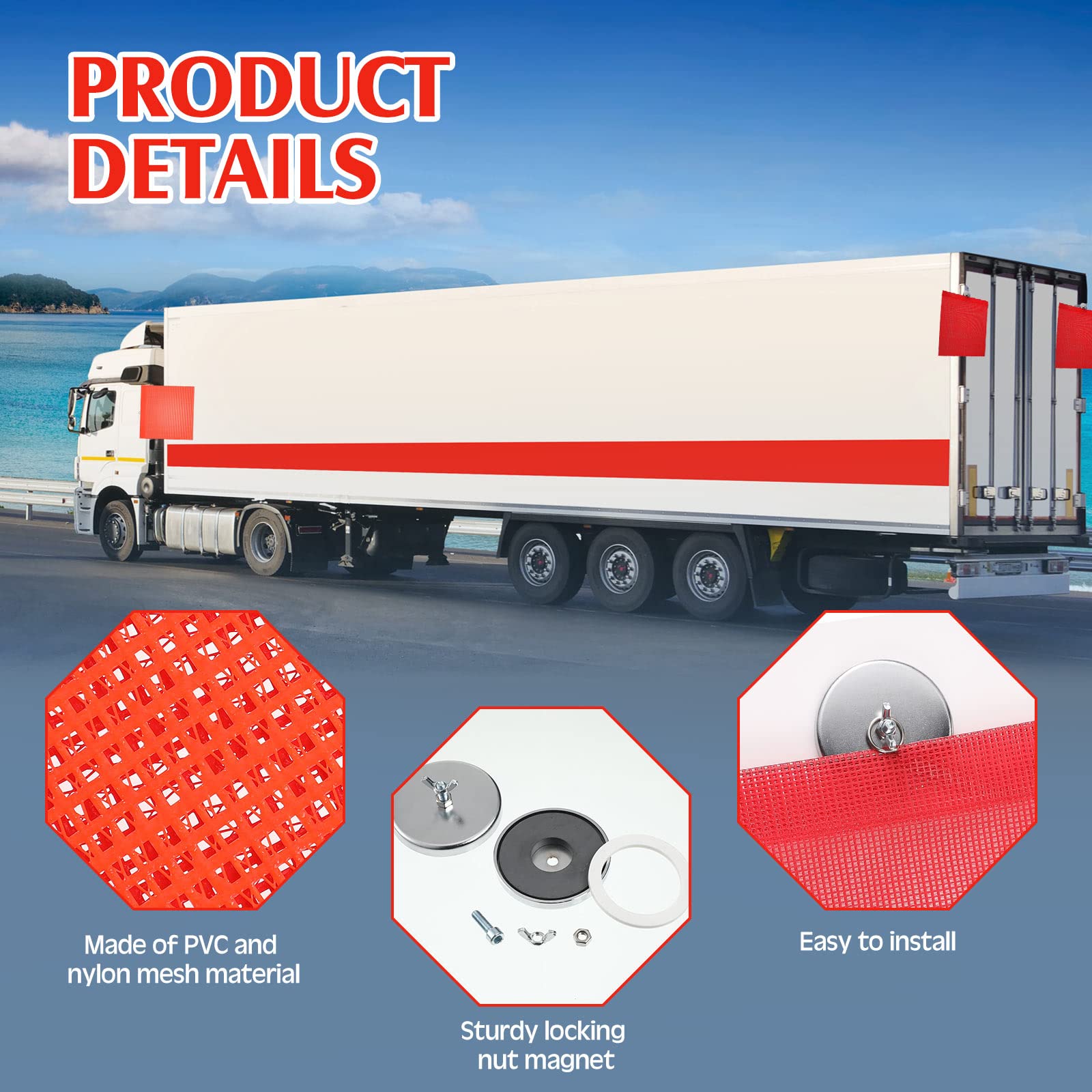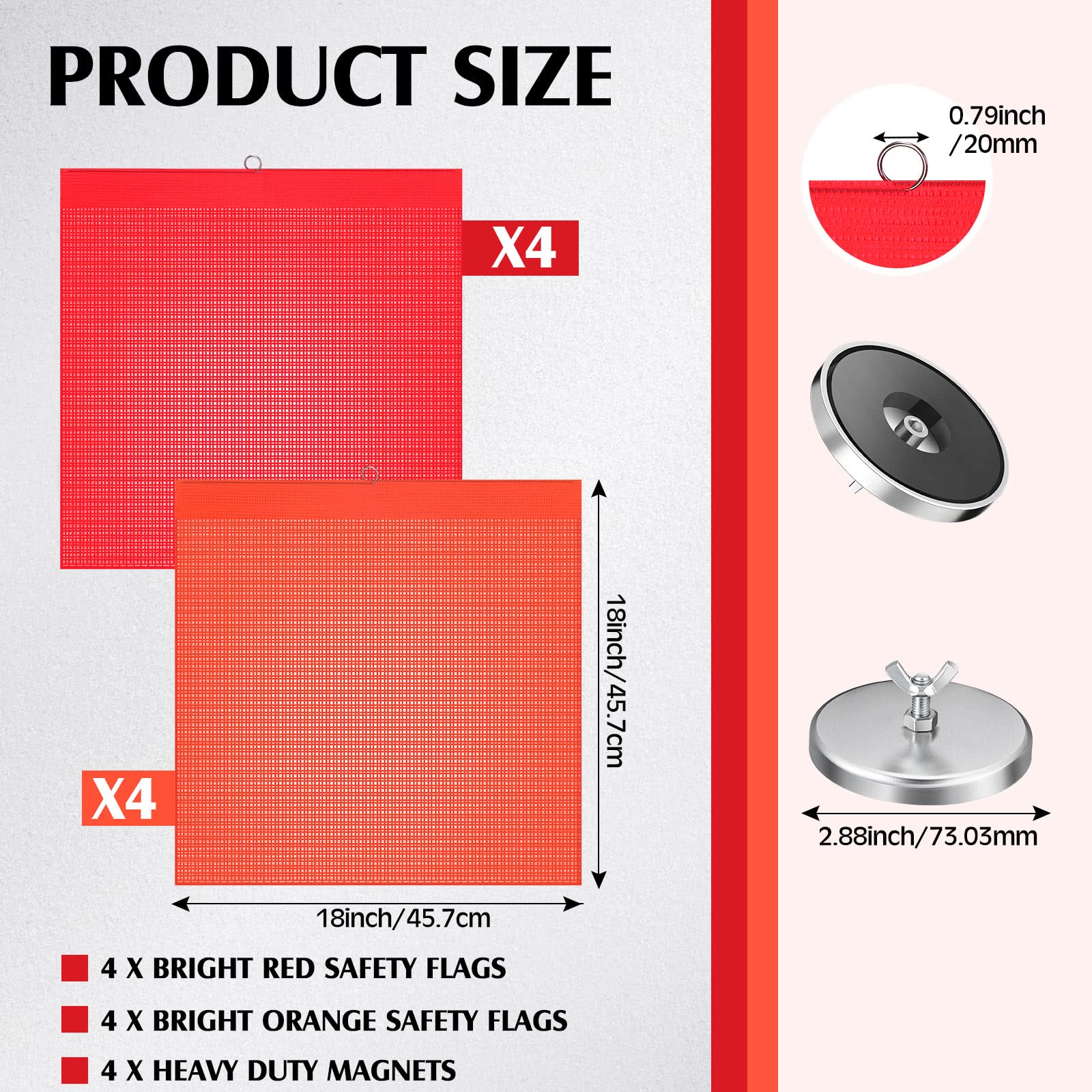 - What you receive: the package comes with 4 pieces red safety flags with wire loop and 4 pieces orange warning flags with wire loop, about 18 x 18 inch, 4 pieces heavy duty nut magnets, totally 12 pieces items in a package, convenient quickly to install the flags; Warning: this product contains magnets. Keep away from children and pets.