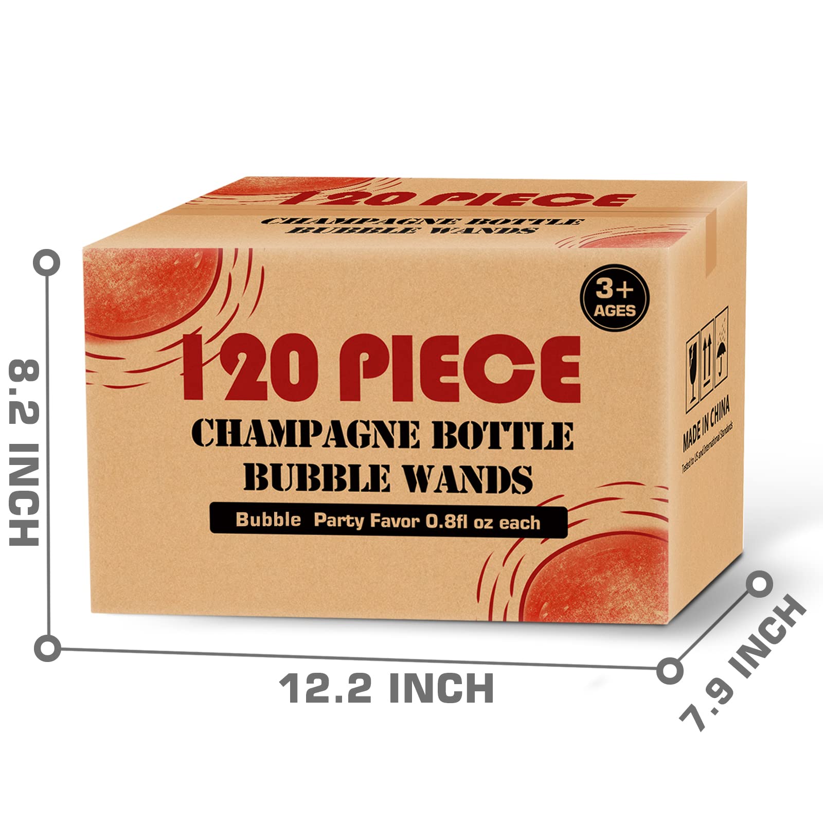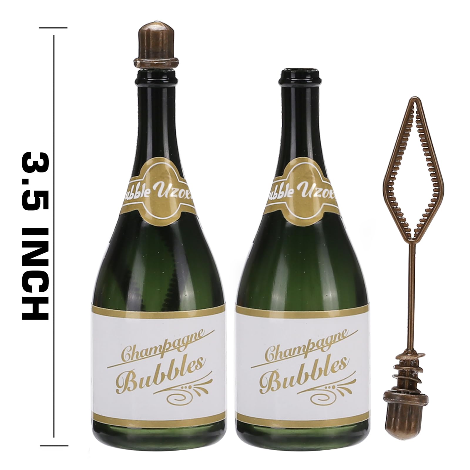 - Super value: 120 pack champagne-shaped bubble wands set are sure to add some romantic idea to your wedding and anniversary parties. Each bottle measures 3.5 inch tall and contains 22.5ml (0.74oz) of solution.