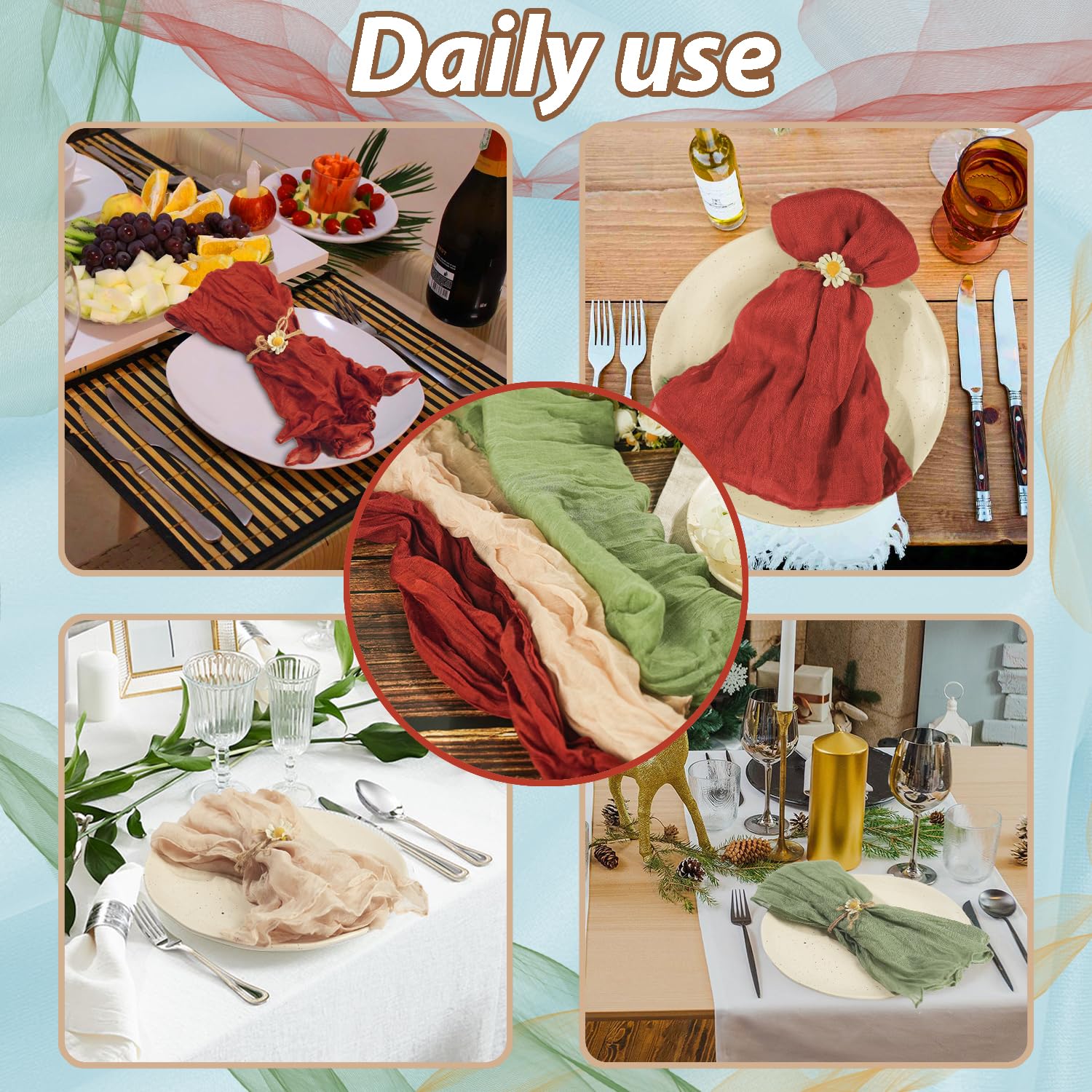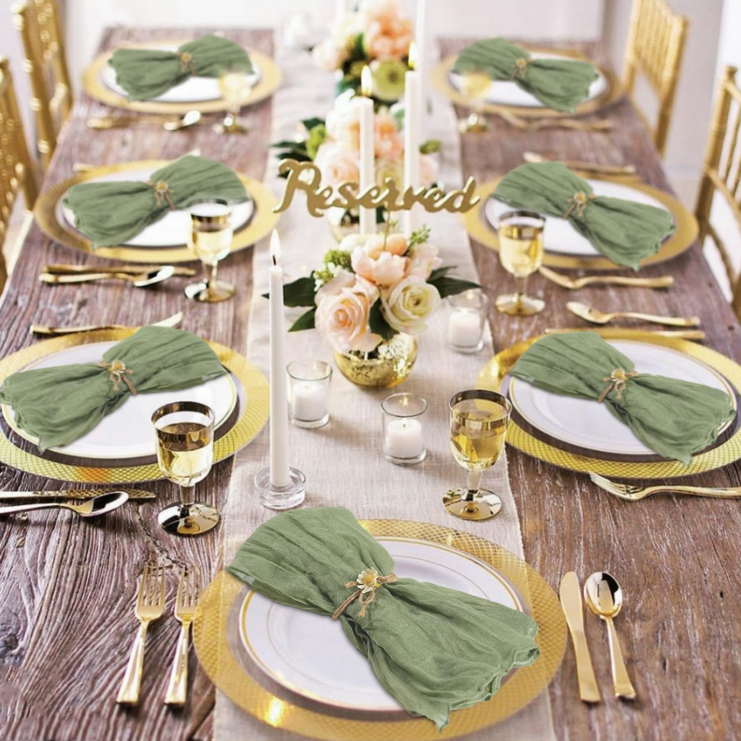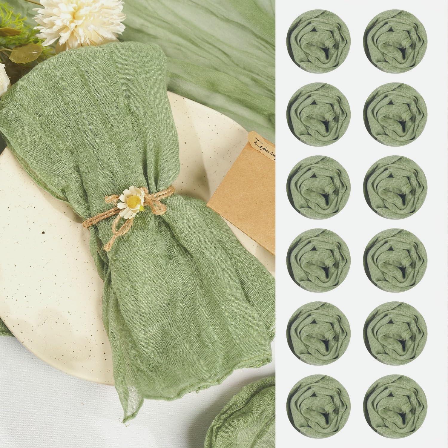 - [Value Pack of Cheesecloth Napkins] You will get total 120 pieces of sage green cheese cloth napkins with wrinkled texture. Each rustic gauze dinner napkin is 20" x 20"/50 x 50 cm. Enough quantity and elegant colors for all your household needs