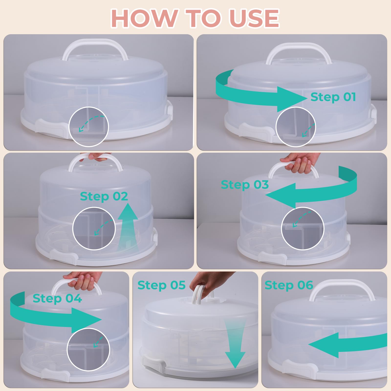 - 【Large Capacity】The height-adjustable cake container can hold up to 11 cupcakes, a 12 inches round or 8 inches square cake, and it fits up to a 7 inches high cake.