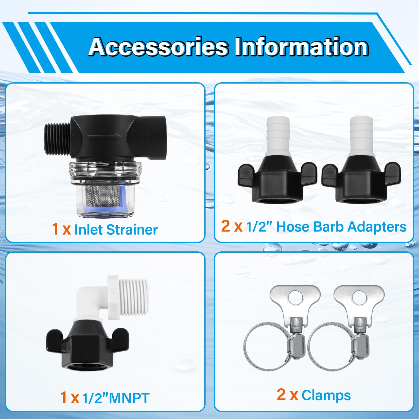 - RV-Ready Pump: 12v sprayer pump follow the standard installation mode applicable to most spray tanks,can replace EF5500-BOX,5151088 and variety models 12V diaphragm pump.12v water pump have glass fiber reinforced polypropylene pump manifolds and ½ "MNPT ports,and are equipped with accessories for connecting hoses and filters,make it easier for you to install and use.