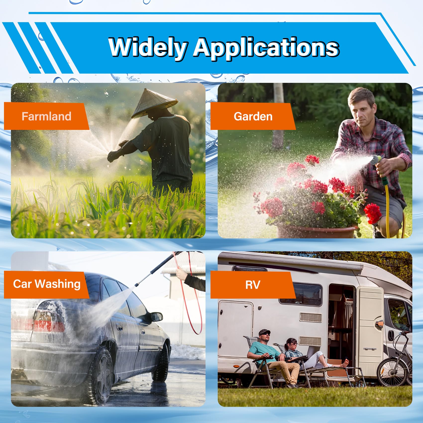 - Powerful Performance: Our 12V diaphragm pump with a flow rate of 6.5 GPM and a maximum pressure of 70 PSI/4.82 Bar. Self priming up to 10 FT.Greatly improved work efficiency and ensuring the efficient operation of the water pump.12V diaphragm pump is widely used in the water supply system of facilities such as RVs,ships or agricultural spraying.