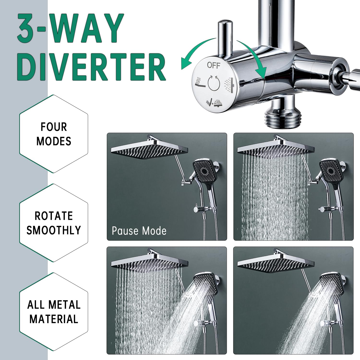 13-Inch Shower Heads with Multi-Function Handheld Sprayer Combo, 3-Way Metal Extended Diverter with Holder and Metal Adjustable Shower Extension Arm, Extra Long Hose(Chrome)