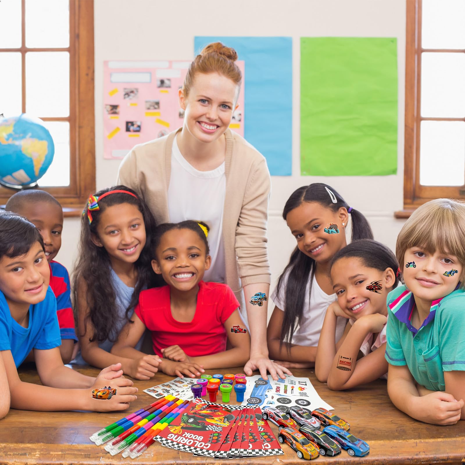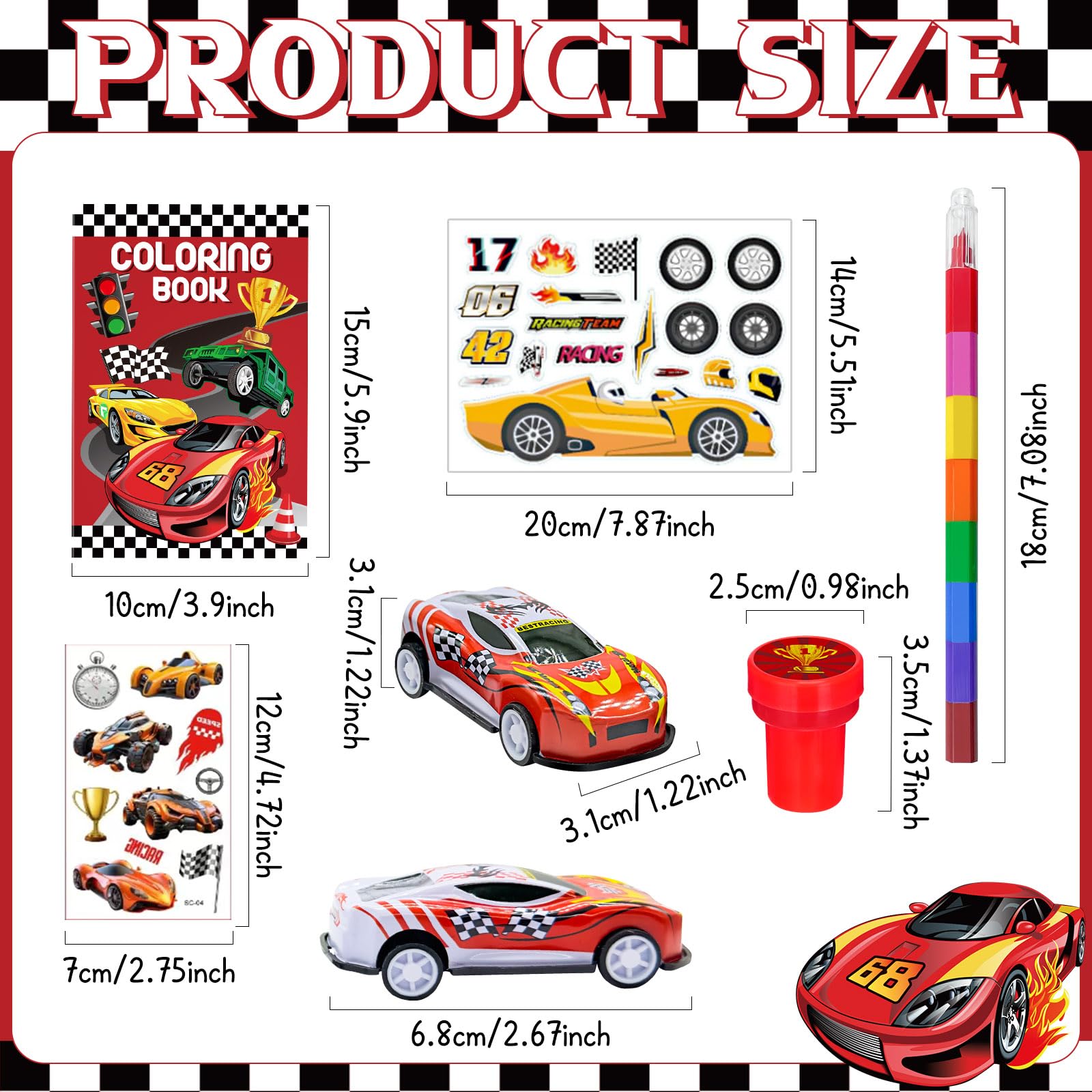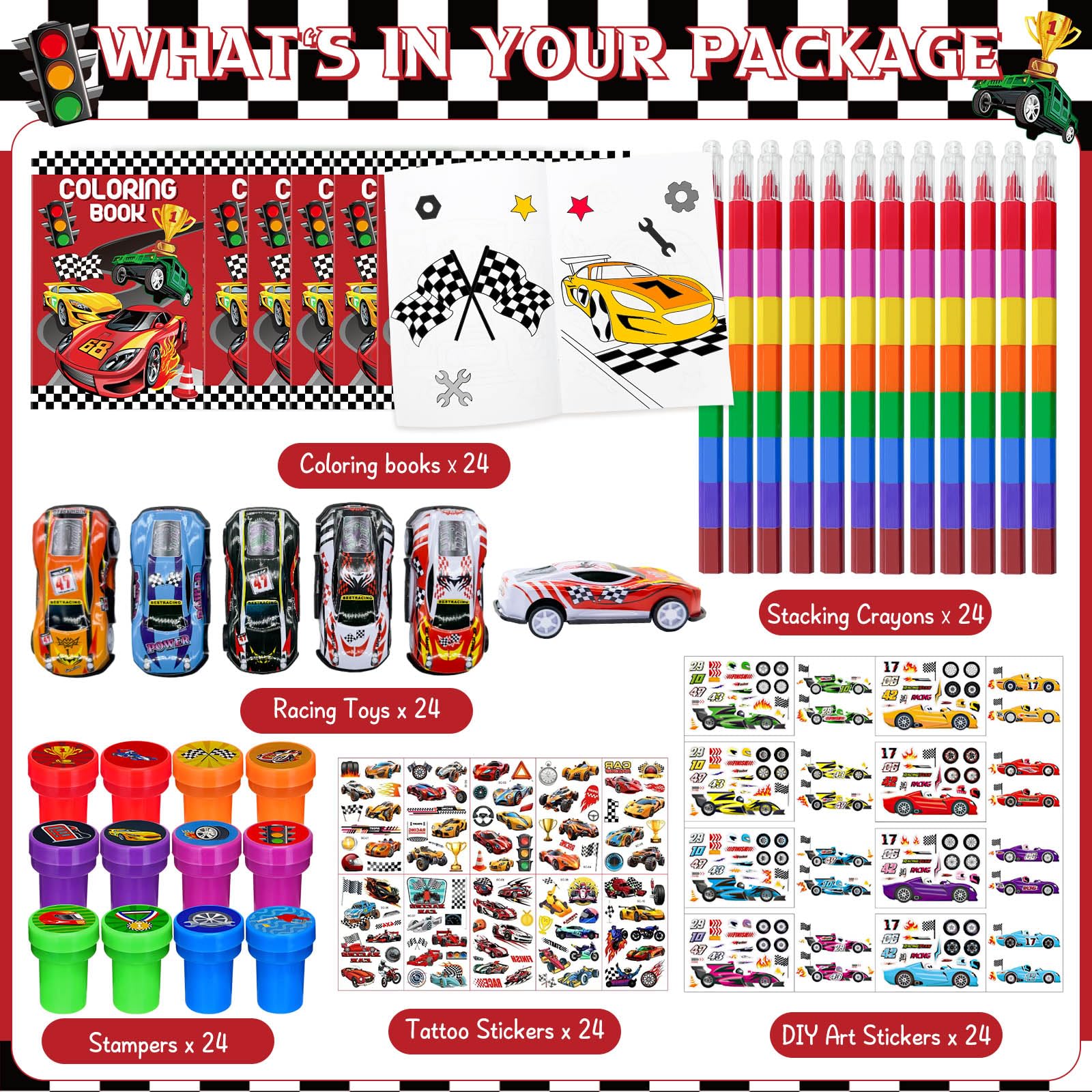 - Race Car Party Favors Set: our Race Car coloring book with crayons bulk includes 24 coloring books(12 pages per book), 24 rainbow stacking crayons(8 colors),24 tattoos, 24 stampers, 24 DIY art craft stickers,24 pull race cars,sufficient quantity, and various styles enrich your checkered flags racing birthday party