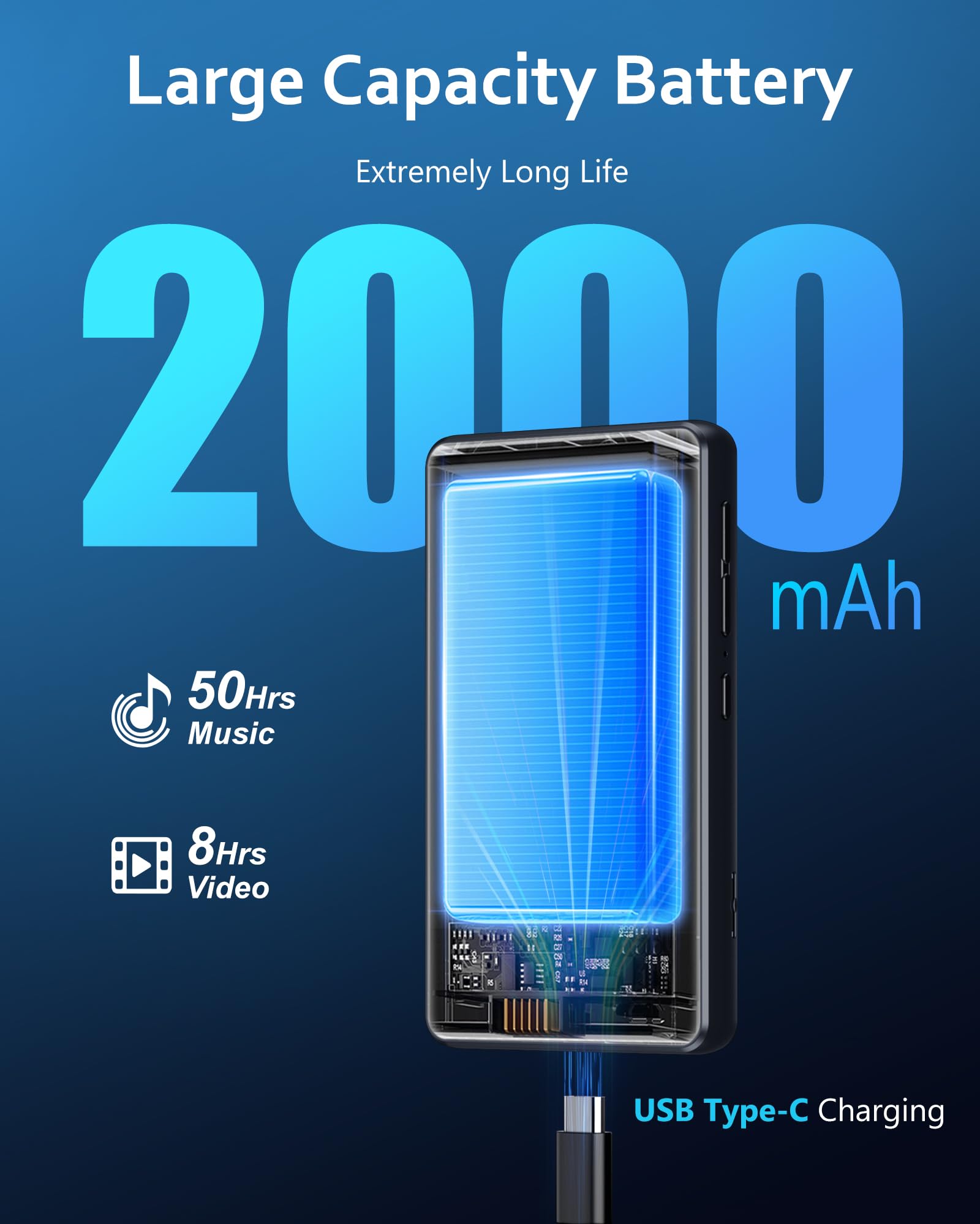 - 【Extended Battery Life: All-Day Entertainment 🔋】 Equipped with a powerful 2000mAh battery, this MP3 Player ensures non-stop music and video playback. With up to 45-50 hours of continuous music playback and 6-8 hours of video playback, you can enjoy your entertainment without worrying about running out of power. Perfect for students, commuters, and outdoor enthusiasts.