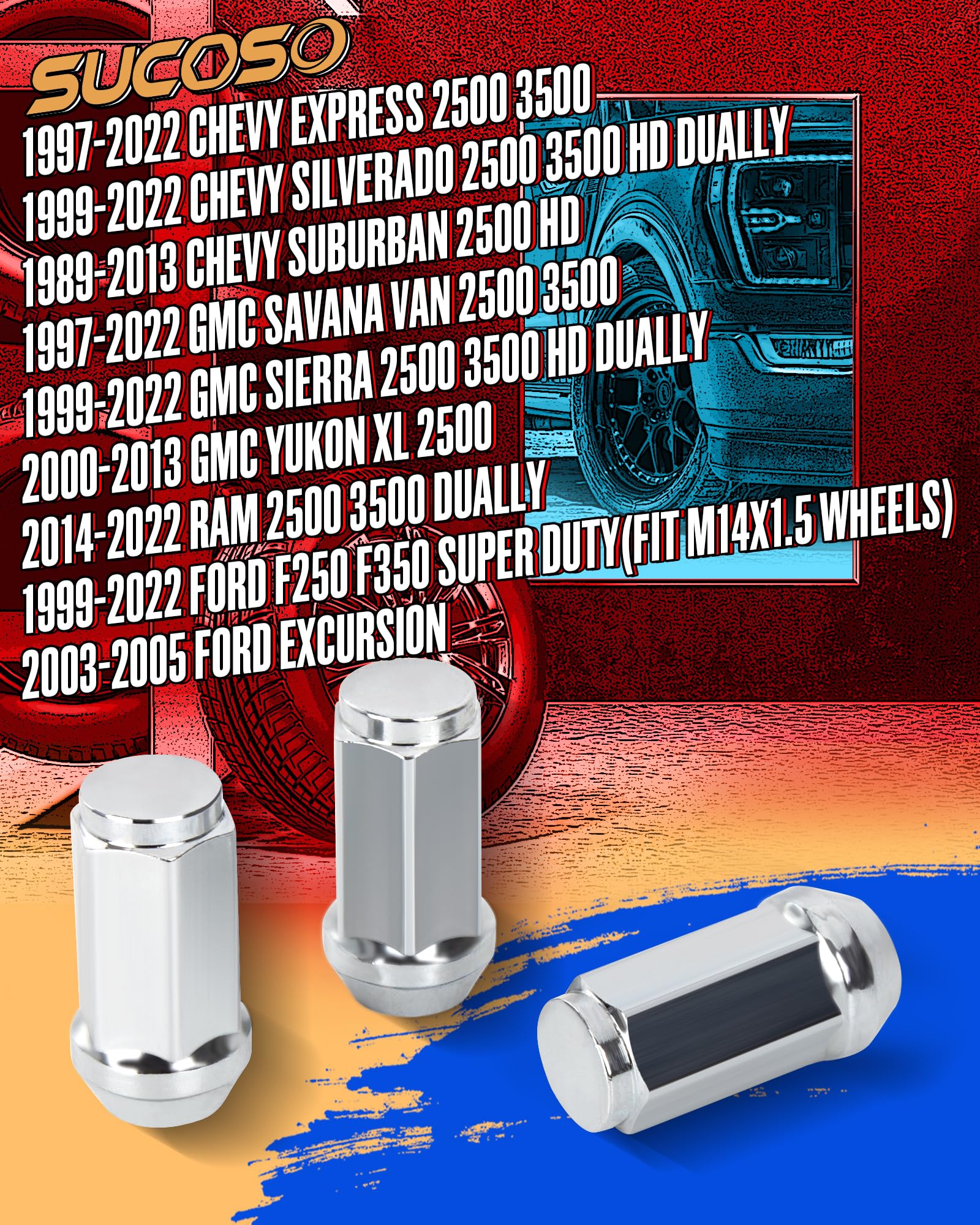 - FITMENT: Fit for Aftermarket Wheels with M14x1.5 Thread Pitch and conical seat.Compatible with 1997-2022 Chevrolet Express 2500 3500 | 1999-2022 Chevrolet Silverado 2500 3500 HD Dually | 1989-2013 Chevrolet Suburban 2500 HD | 1997-2022 GMC Savana Van 2500 3500 | 1999-2022 GMC Sierra 2500 3500 HD Dually | 2000-2013 GMC Yukon XL 2500 | 2014-2022 Ram 2500 3500 Dually | 1999-2022 Ford F250 F350 Super Duty(only fit m14x1.5 wheels) | 2003-2005 Ford Excursion.