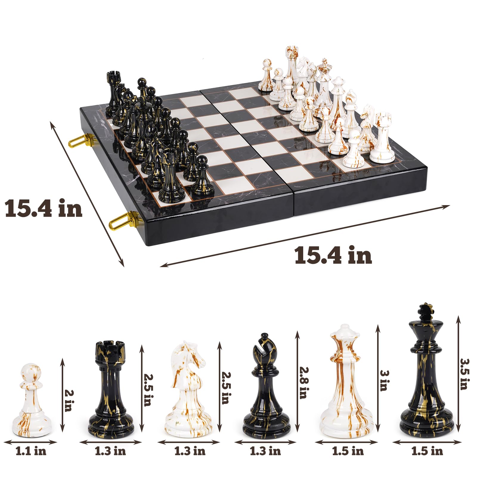 15" Large Chess Set for Adults with Weighted Acrylic Chess Pieces 3.5" King & Portable Folding Marbling Wooden Chess Board Travel Chess Sets Family Board Game Gift – Elegant Classic Chess Game