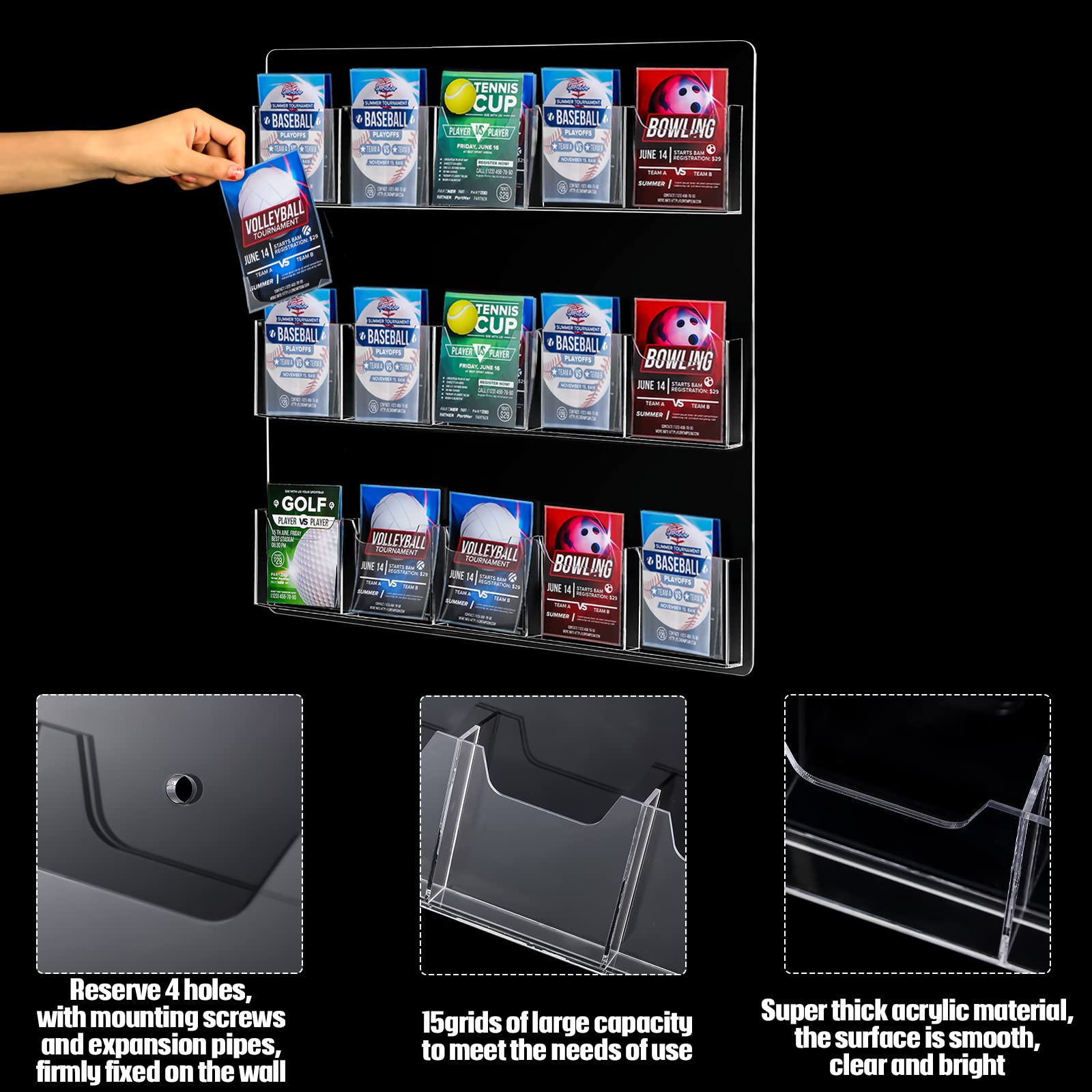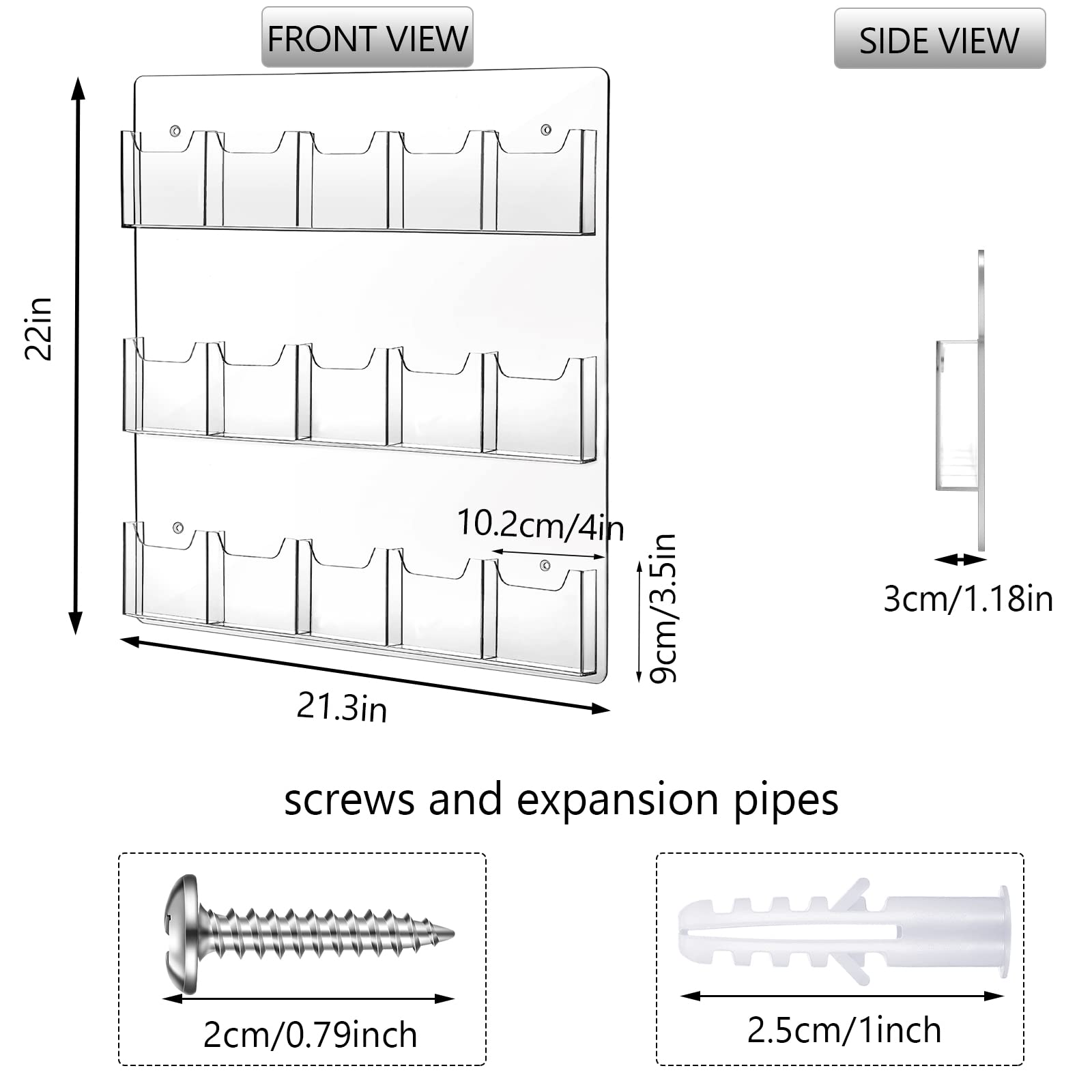 - Universal Size: the overall dimension of our acrylic brochure wall mount holders is 22 x 21 inches, each pocket dimension is 4 x 1 inch, and each pocket capacity is approx 50 postcards, this is a useful business card or gift card wall display solution