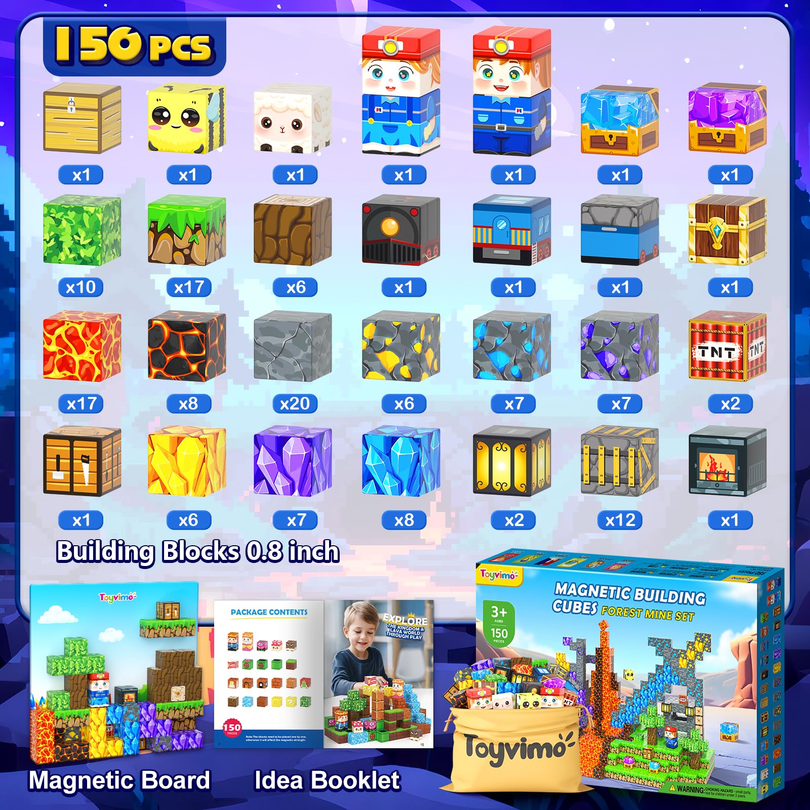 - MAGNETIC BUILDING BLOCKS: Let's explore the mysterious mine cave with this 150pcs magnetic blocks and explore the magworld of infinite possibilities! Each building block is UV printed, and the lifelike patterns inspire kids to imagine scenes such as forest cabins, mines and mine tracks. Rich elements such as grass, leaves, lava, mine, tracks and miners allow kids, boys & girls to immerse themselves in role-playing, constantly stimulating imagination, creativity and concentration