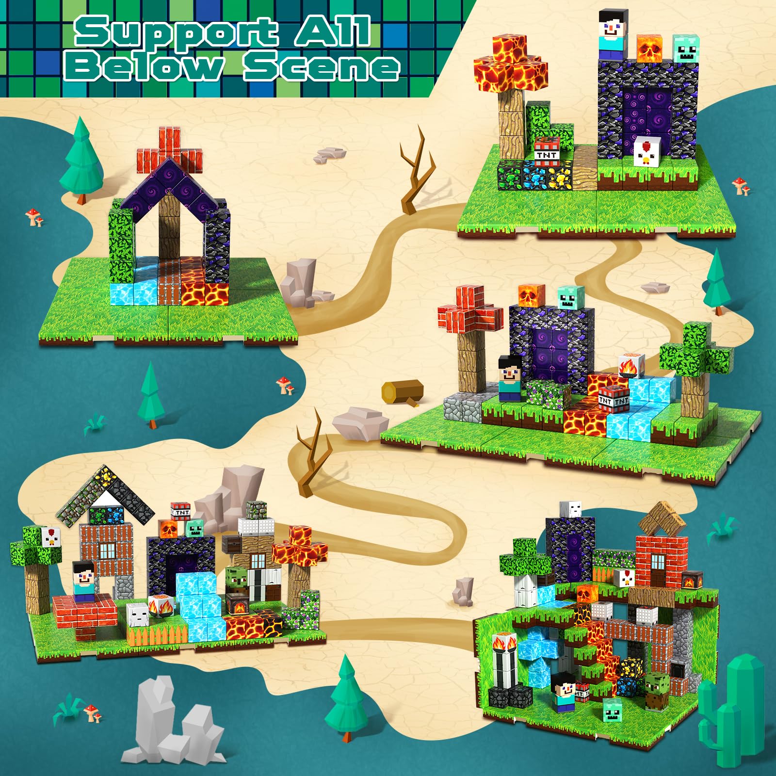 - 【150PCS Magnetic Blocks with 6 Bases】This magnetic blocks toy set sparks imagination with 150 pieces and 6 expandable plates (each fitting 25 blocks, 5x5). It brings thrilling worlds to life, from magical homes and winding minecart tracks to hidden treasure caves and a glowing magic portal. The included idea booklet guides kids through fun builds and encourages them to create their own adventures freely.