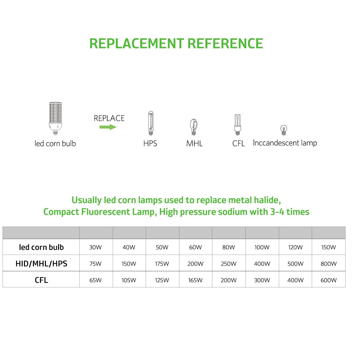 - SUPER BRIGHT:150 Watt corn cob led bulb has a brightness of up to 19500lm,and the LED Replaces 400 Watt metal halide/mercury vapor/high-pressure sodium bulbs,LED retrofit high power incandescent bulb/CFL bulb.It has 360 degree-shine with no dead corners and no flicker,giving you a very clear and bright space.
