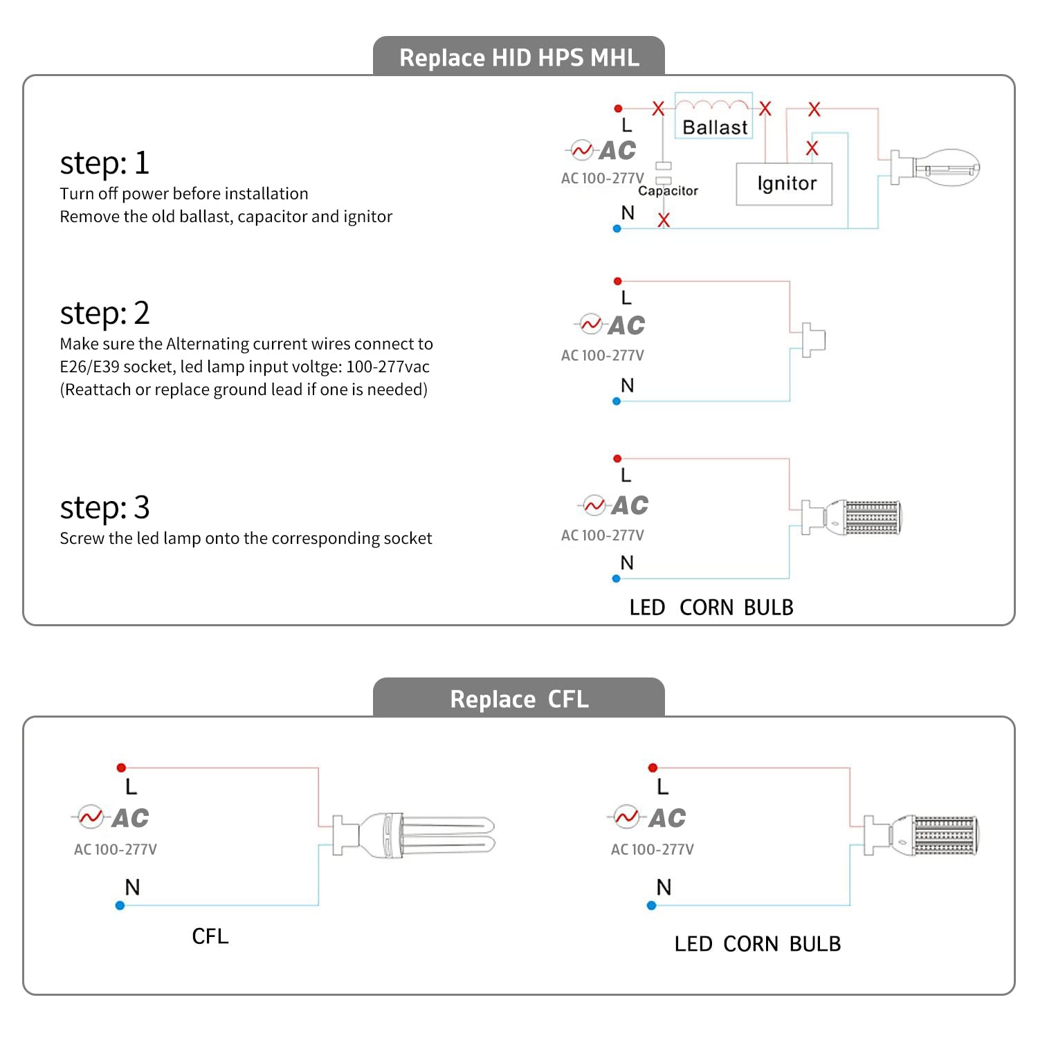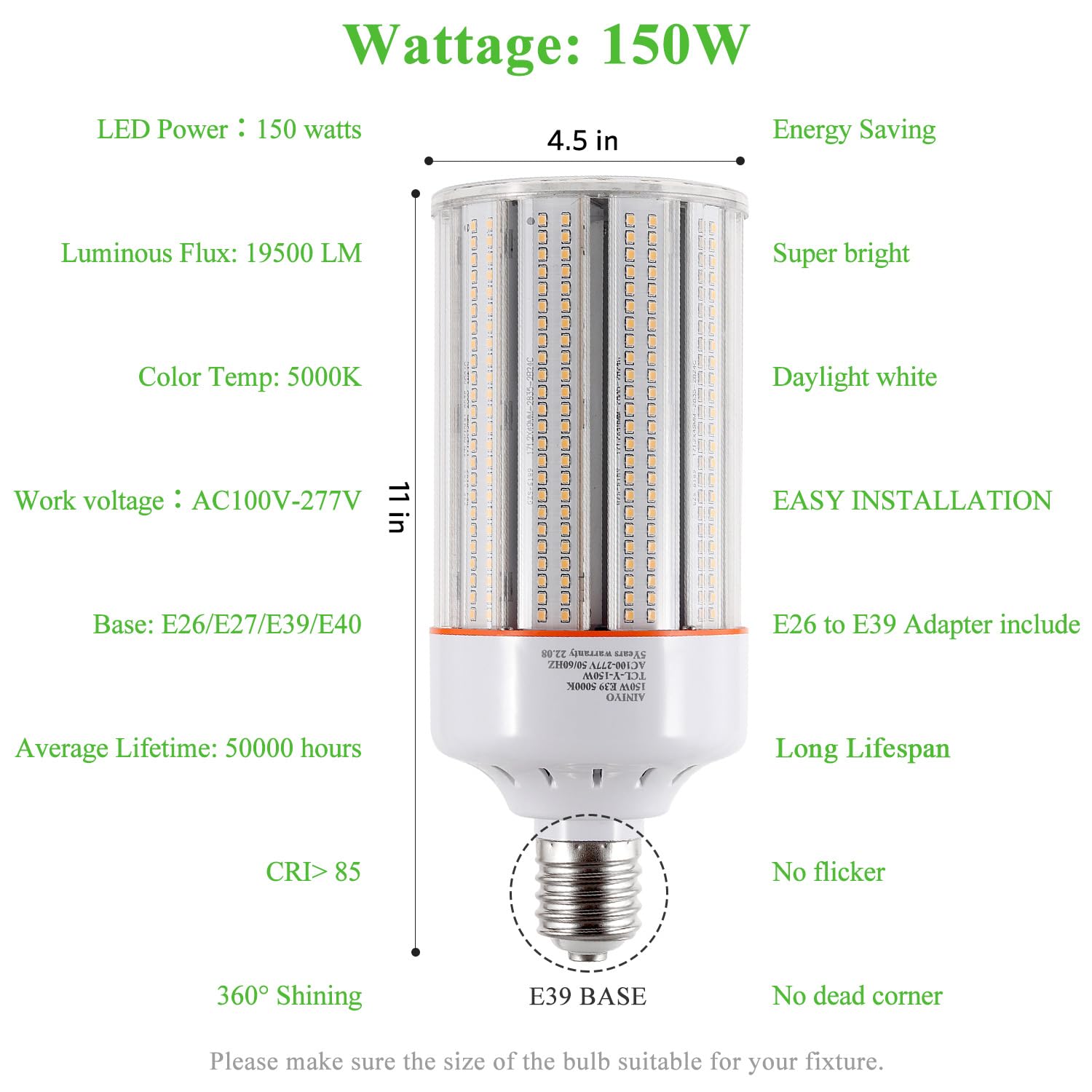 - EASY INSTALLATION: We have configured adapters for each 150W led corn bulbs,It can be easily connected directly to a large mogul E39 Base/E26 Medium Base-just by screwing in.In addition,the 150W corn light bulb is available at 110v or 277 V,and comes with an internal driver for single-component installation(No ballast needed.Just connect the wires directly).The bulb size is:11*4.6 inches