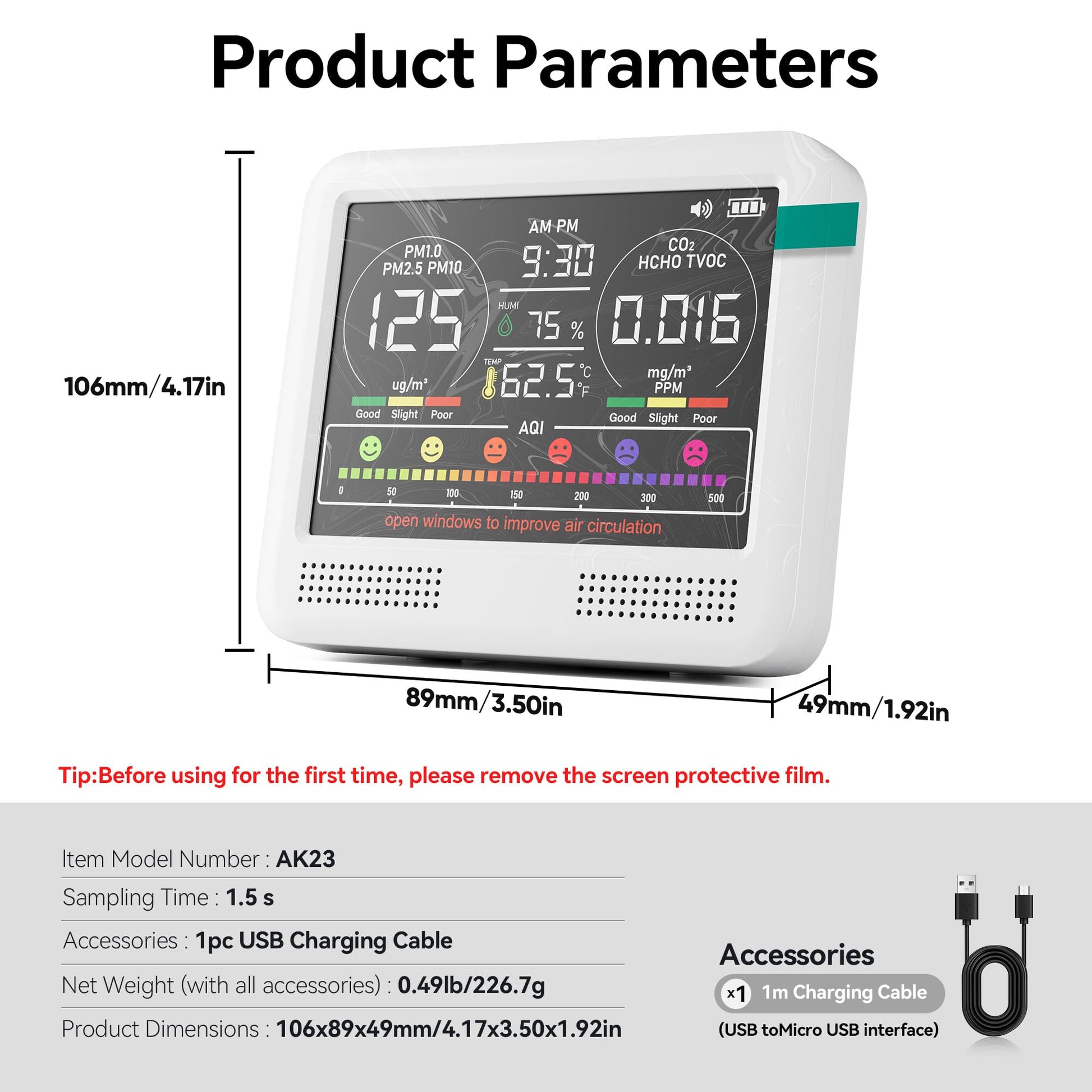 - [All-in-One 16-in-1 Air Quality Monitoring]: This Air Quality Monitor Indoor offers a complete solution for tracking your environment. It accurately measures 16 essential air quality indicators, including CO2, PM1.0, PM2.5, PM10, temperature, humidity, formaldehyde (HCHO), and volatile organic compounds (VOCs). Resampling every 1.5 seconds, it provides real-time feedback, making it an ideal air quality tester for home, office, or any indoor space where clean air matters.