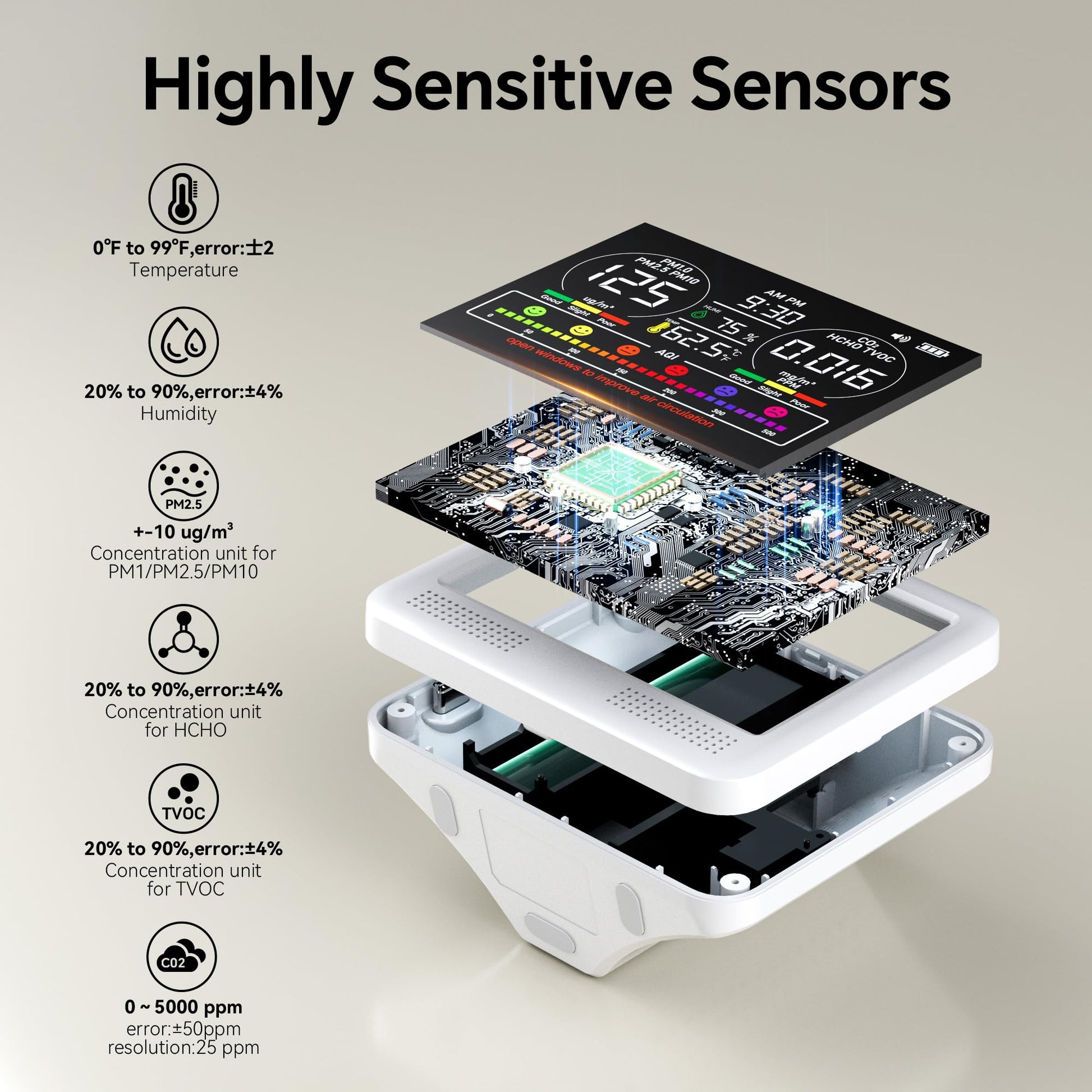 - [High Precision with Rapid Sensor Response]: Engineered with advanced high-precision sensors and a powerful processing chip, this monitor ensures fast and accurate readings. It quickly detects changes in your surroundings, refreshing data constantly so you can track even the slightest shifts in indoor air quality. Perfect for anyone looking to conduct a thorough and reliable home air quality test.
