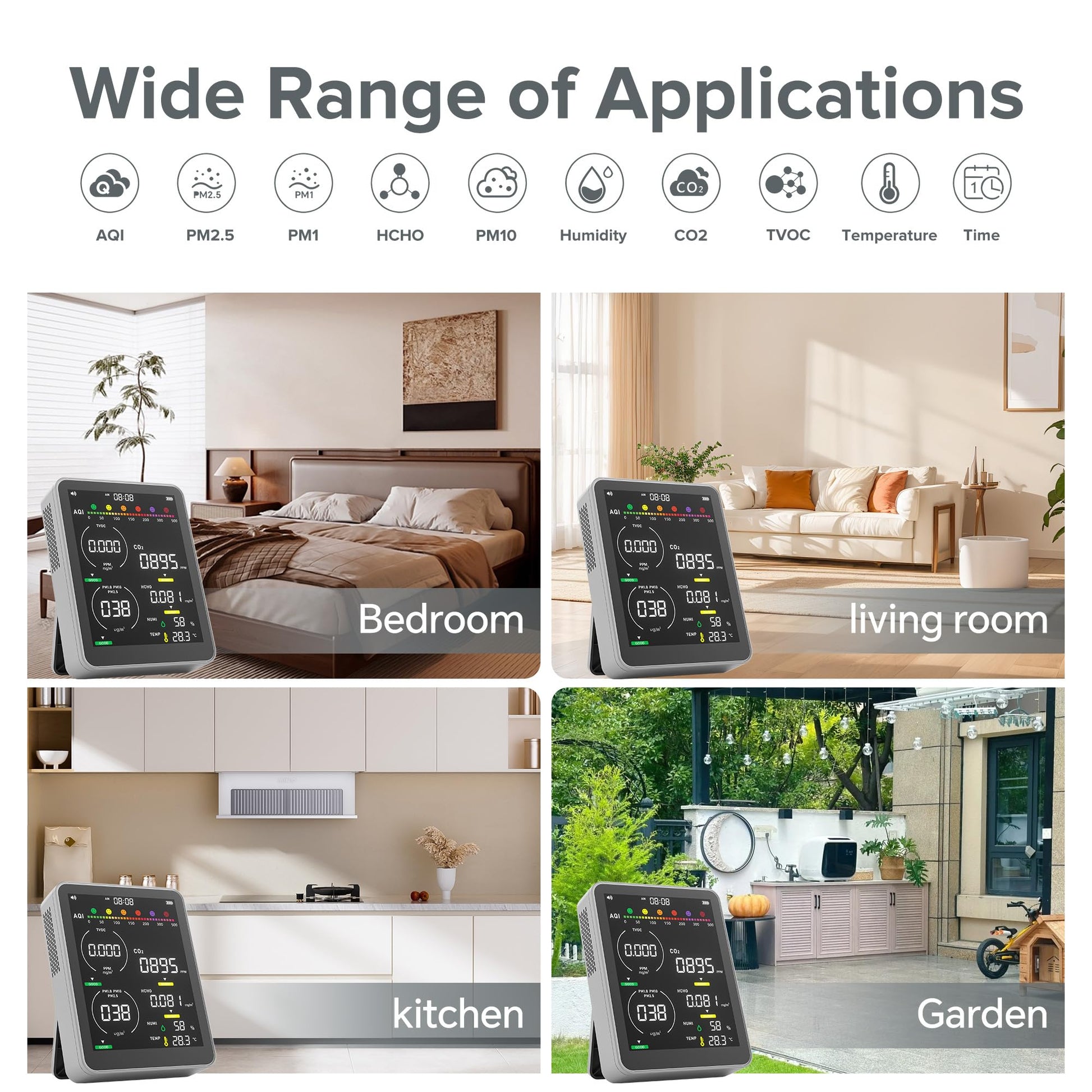 - 【Buzzer Alarm】The air quality monitor built-in "BBB..." buzzer will trigger an alarm whenever any air quality level reaches a dangerous threshold, promptly alerting you to current air conditions. Once activated, the buzzer can Short press lo tum onoff the beeps off to ensure it doesn’t disturb your rest time.