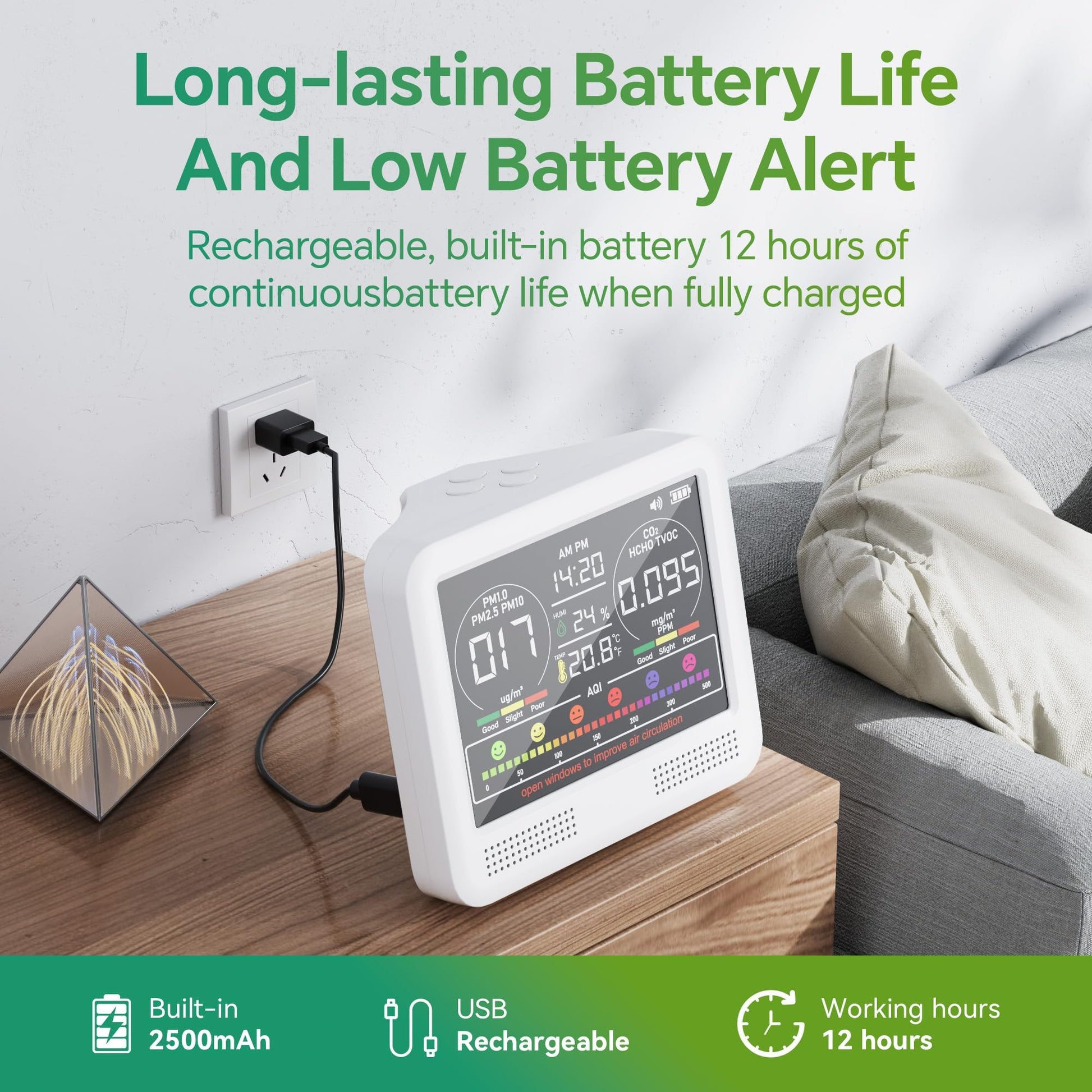 - BUZZER ALARM: The air quality monitor built-in "BBB..." buzzer will trigger an alarm whenever any air quality level reaches a dangerous threshold, promptly alerting you to current air conditions. Once activated, the buzzer can be manually turned off to ensure it doesn’t disturb your rest time