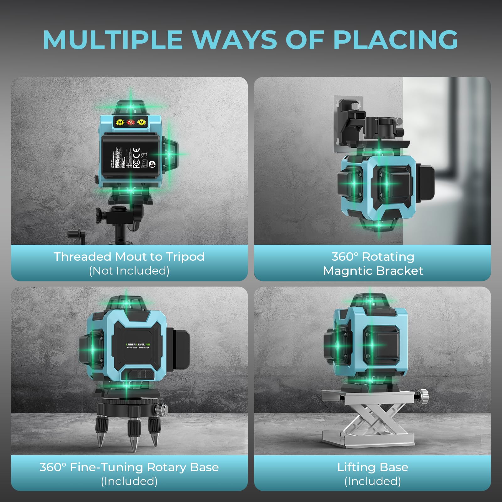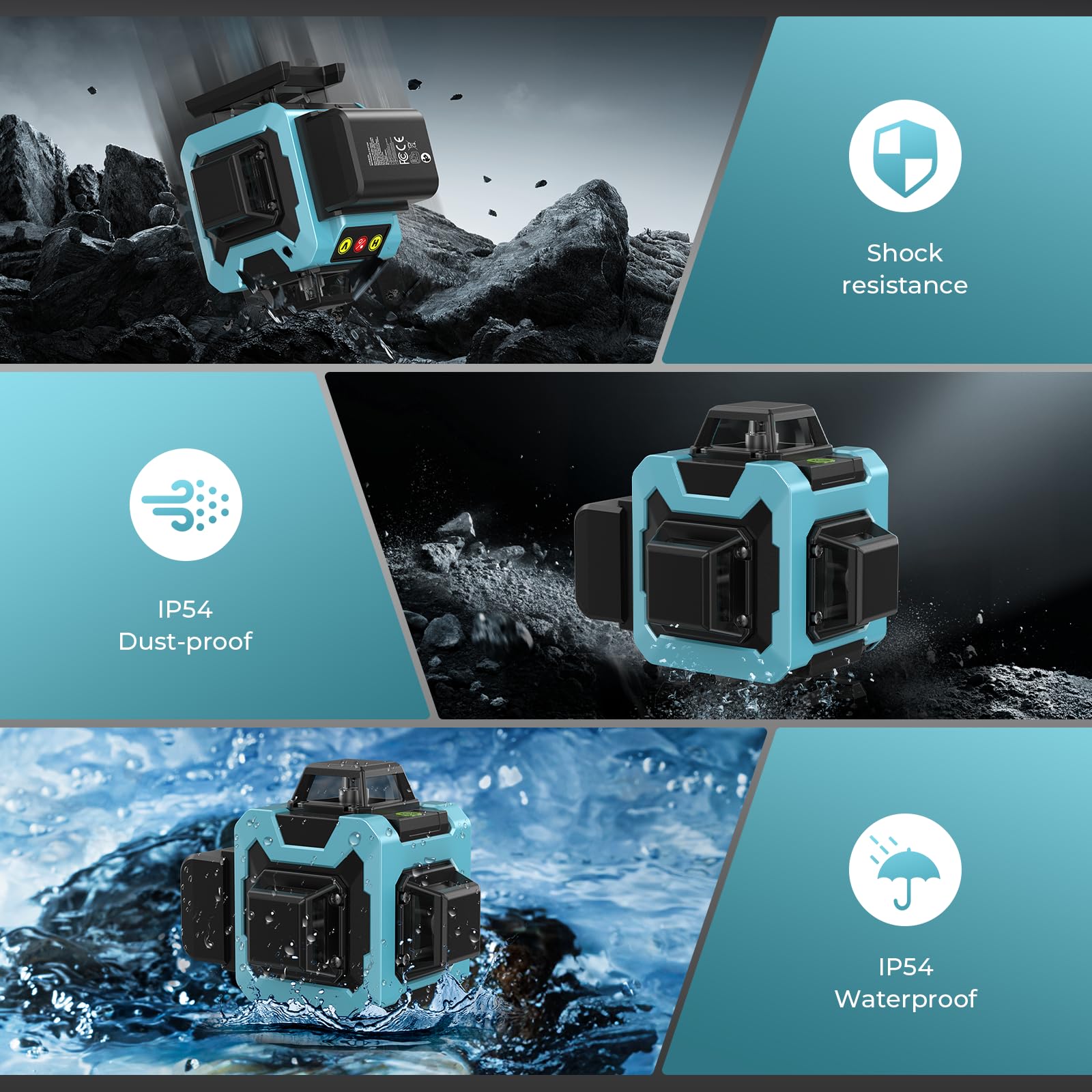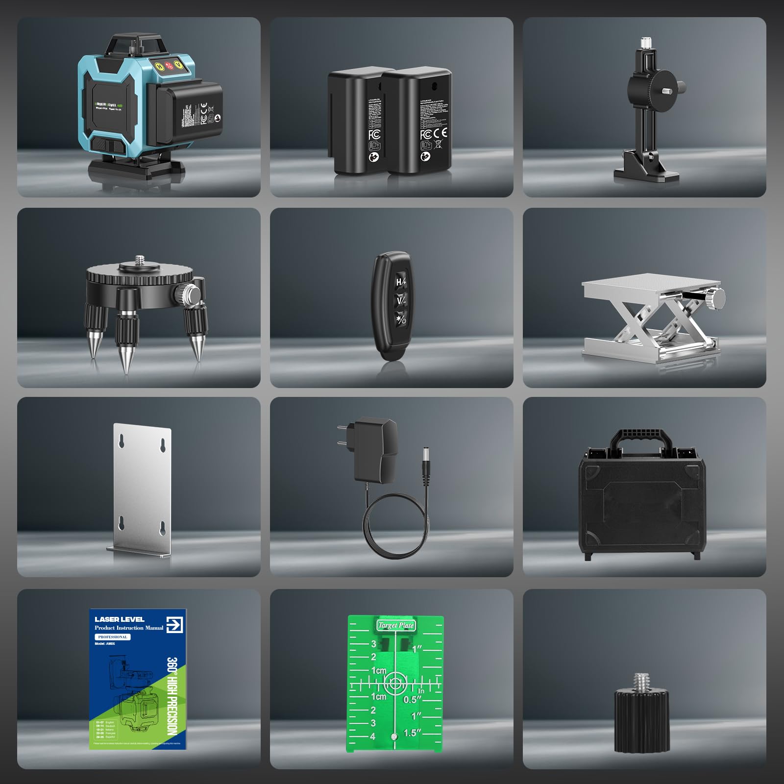 - 【Durable Design/Packaging List】IP54 waterproof/dusterproof to ensure that you can work normally and stably under complex working conditions. 1x 4D 16 Lines Laser Level, 1x Carry Bag, 1x Power Charger, 1x 1/4”Tread Mount, 1x 5/8-20" Tread Mount, 1x Wall Iron, 1x User Manual, 1x Remote Control, 1x Green Target Plate, 1x Wall Bracket, 1x Lifting Platform, 2x 2400mAH Batteries.